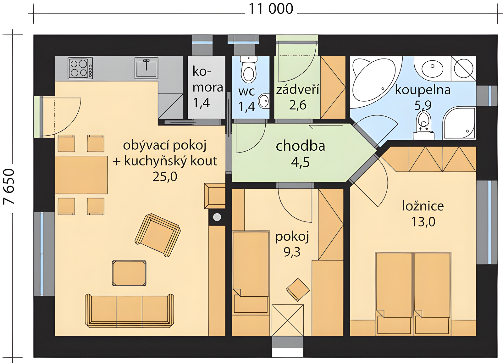 Rodinný dům Aňa patří mezi menší přízemní domy pro jednu rodinu. Jednoduchá dispozice se sníženou výškou podélných obvodových stěn umožňuje úsporu materiálu a zásadně neomezí využití pokojů. Obývací pokoj, osvětlený francouzským oknem, se vstupem do zahrady, tvoří s kuchyňským koutem jeden obytný prostor v pravé části domu. V druhé polovině domu se nachází ložnice, koupelna a pokoj, který lze využít i jako pracovnu, hobby místnost nebo prostornou šatnu. Dům má komín, v obývacím pokoji lze vystavět krb, nebo instalovat krbová kamna.
