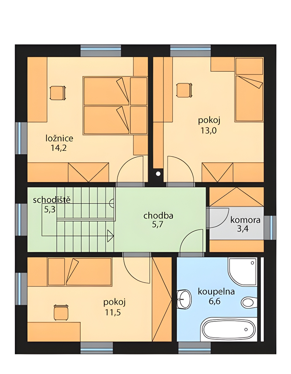 Rodinný dům Anežka patří mezi dvoupodlažní domy s pěti prostornými obytnými místnostmi a samostatnou kuchyní, navržený pro bydlení vícečlenné rodiny. Zádveřím vstoupíme do chodby, ze které se dále vstupuje do všech místností v přízemí-vlevo do obývacího pokoje, pracovny /může sloužit jako pokoj pro hosty/, vpravo do kuchyně. WC s přilehlou technickou místností je přístupné již ze zádveří. Obývací pokoj je opatřen krbovými kamny. Na terasu se vstupuje z obývacího pokoje. V 2.NP, které je přístupné po schodišti z chodby, jsou další dva pokoje, ložnice, komora a koupelna s toaletou, umyvadlem, vanou a sprchovým koutem. Fasáda je řešena štukovou omítkou v kombinací s dřevěným obkladem.