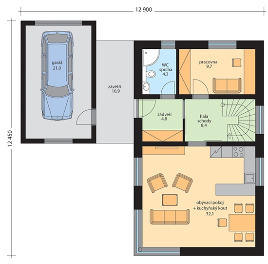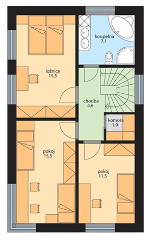 Rodinný dům Antal je modernějšího vzhledu se samostatnou garáží, určený do městské zástavby, jehož praktická dispozice nabízí pohodlné bydlení vícečlenné rodině. Vstup do domu je z krytého závětří propojujícího dům s garáží. Půdorys je tvaru obdélníku s dominantním prostorem obývacího pokoje s částečně prosklenou fasádou. Součástí obývacího pokoje je kuchyňský kout s barem. Vstup na terasu je v obývacím pokoji možný prosklenou sestavou s dvoj a trojkřídlými dveřmi. Hygienické a sociální zázemí zajišťuje samostatná místnost WC se sprchou. Uspořádání dispozice nabízí i dostatečné množství úložných prostor. V 2.NP je ložnice a dva obytné pokoje, koupelna a komora, která může sloužit jako šatna, nebo i technická místnost.