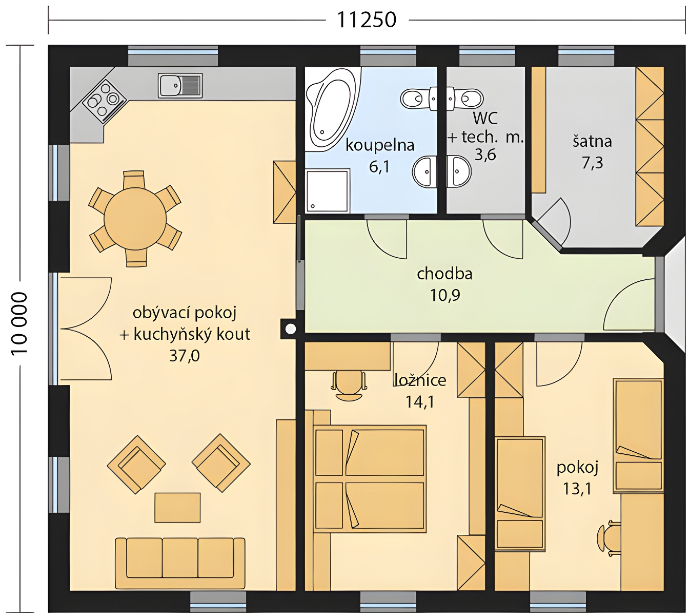 Přízemní rodinný dům ANTON o velikosti bytové jednotky 3+kk je vhodný pro bydlní jedné rodiny. Na jednoduchém obdélníkovém půdorysu vzniká klasická dispozice obývacího pokoje propojeného s kuchyňským koutem, ložnice, pokoje a prostorné šatny, kterou lze využít i jako malou pracovnu. Z obývacího pokoje je vstup na terasu. V koupelně je vana, sprchový kout, umyvadlo a toaleta. Samostatné WC slouží částečně i jako technická místnost, kde je prostor pro kotel a pračku.