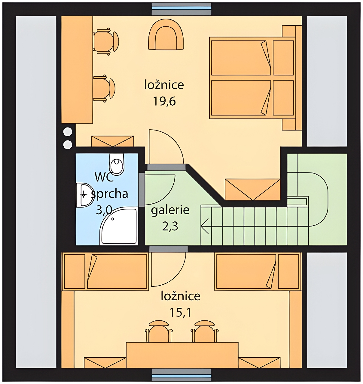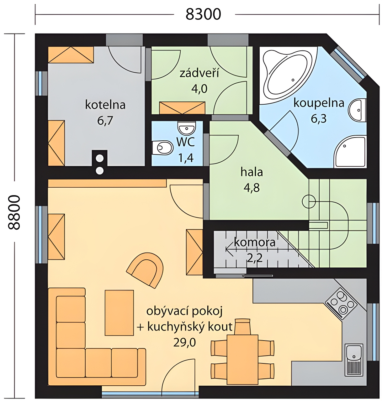 Rodinný dům Apolenka je menší, samostatně stojící, rodinný dům s plně využitým podkrovím, určený pro bydlení jedné rodiny. Do domu se vstupuje zádveřím do haly propojující místnosti v přízemí -obývací pokoj s kuchyňským koutem, koupelnu a samostané WC. Z obývacího pokoje se vstupuje na terasu. Pracovna, která může sloužit jako technická nebo více účelová místnost, je přístupna ze zádveří. Prostor pod schody je využitý jako spíž nebo komora. V podkroví je ložnice, dětský pokoj a malá koupelna s toaletou, umyvadlem a sprchovým koutem.
