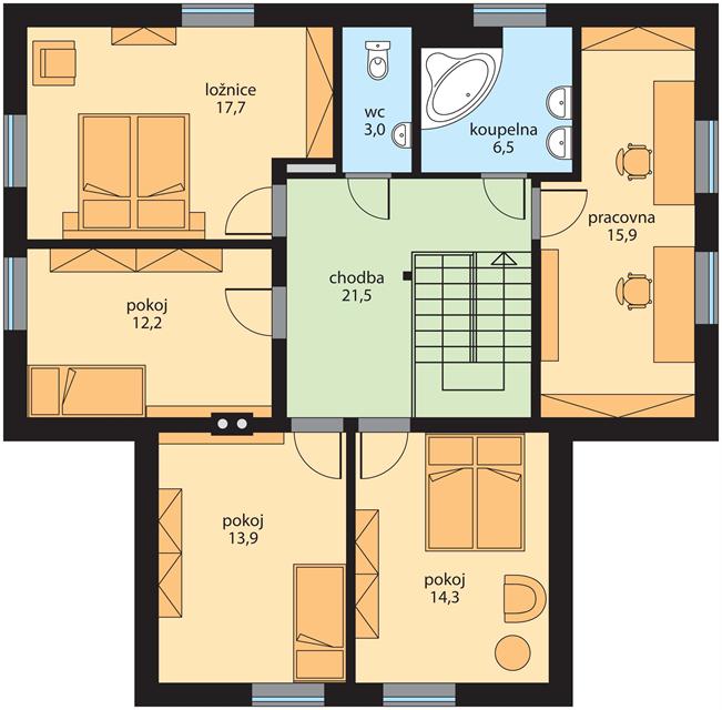 Rodinný dům Barča je přízemní dům s plně využitým podkrovím, který uspokojí potřeby pro bydlení i náročnějšího investora. Dům půdorysného tvaru písmene T má sedlovou střechu o sklonu 38°. V přízemí se nachází obývací pokoj a kuchyň s jídelnou a spíží, prádelna, dále místnost, kterou lze využít jako šatnu, komoru, na domácí práce nebo další pracovnu. V podkroví je ložnice, dva pokoje, pokoj pro hosta a pracovna. Z obývacího pokoje a jídelny je vstup na venkovní terasu.