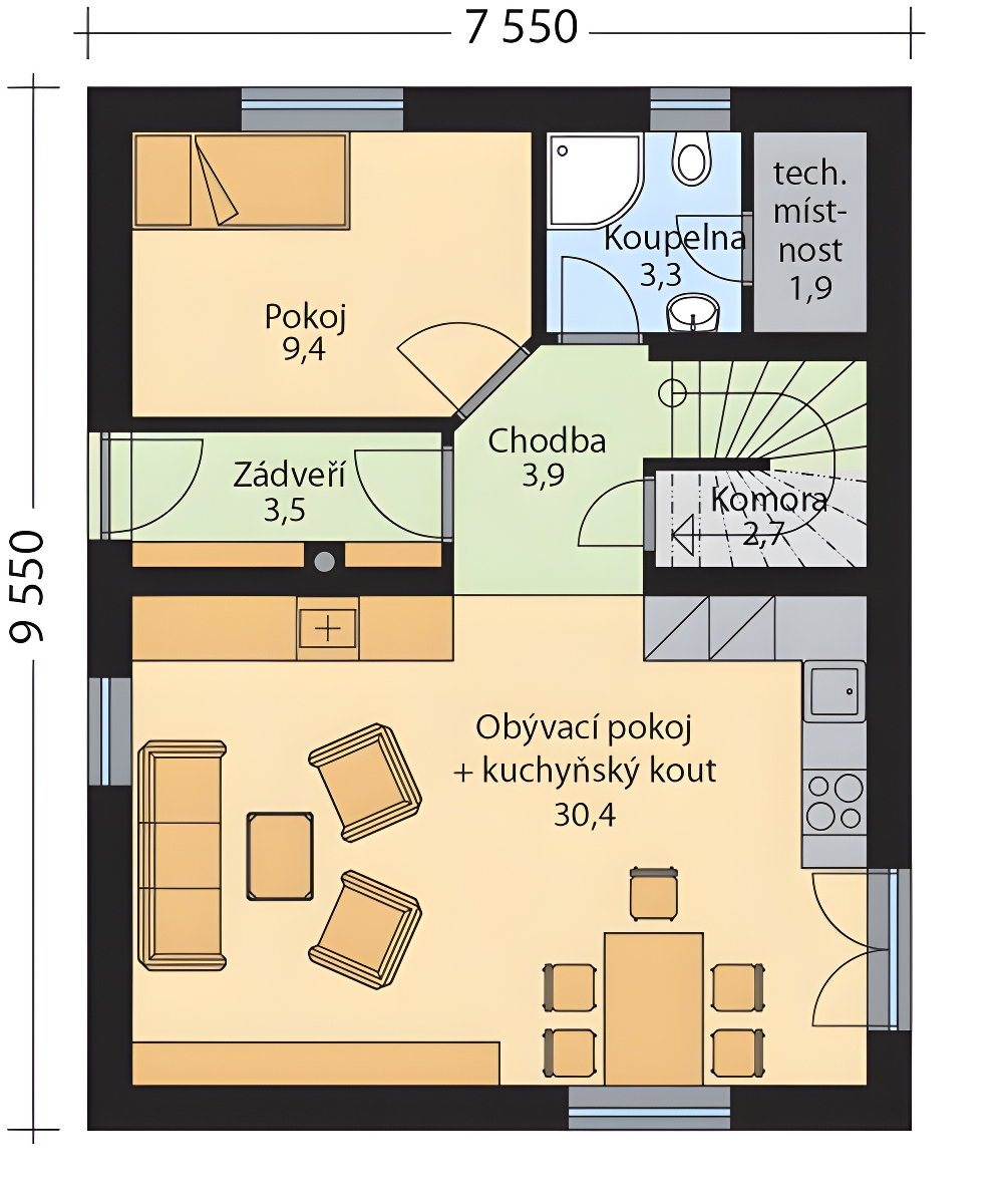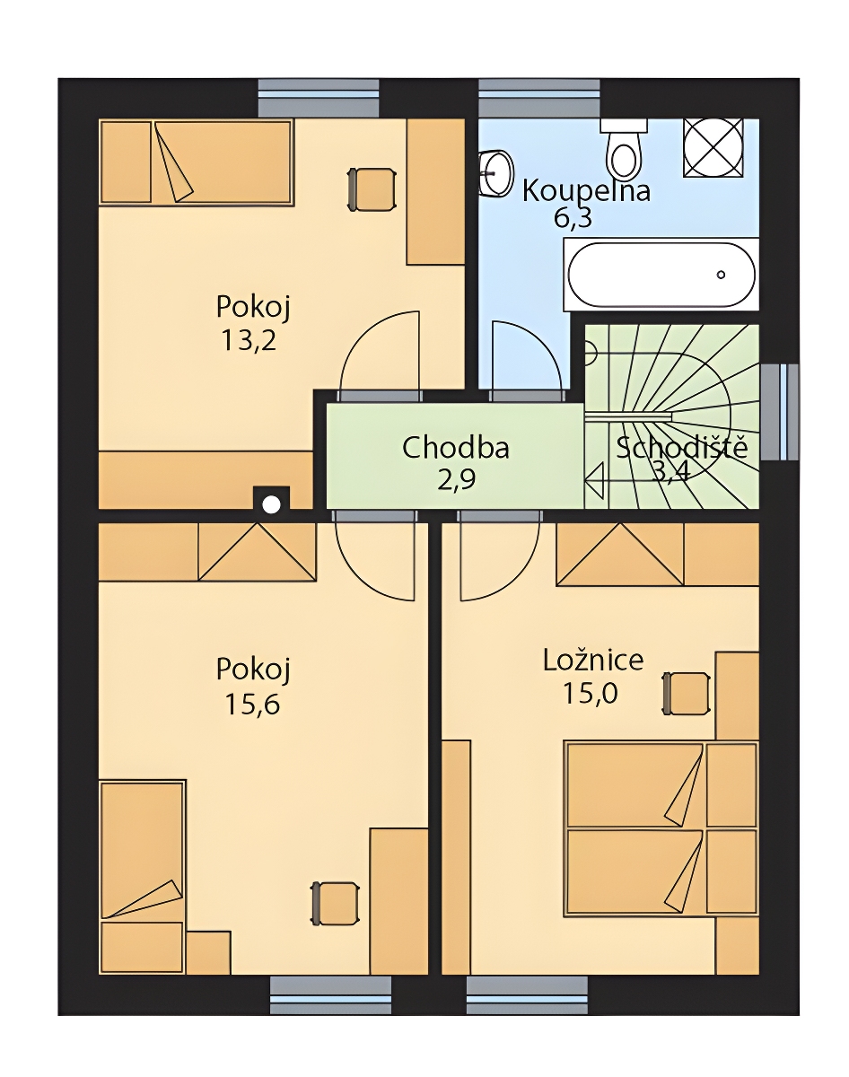Rodinný dům Berenika je menší dům s plně využitým podkrovím, určený pro bydlení jedné rodiny. Dispozičně je dům rozdělený na denní část s obývacím pokojem a pokojem (pracovnou) v přízemí a noční část v podkroví. Obývací pokoj s kuchyňským koutem vytvářejí jeden prostor s výstupem na terasu. Po schodišti se z chodby dostaneme do podkroví, které tvoří tři obytné místnosti-ložnice a dva pokoje a koupelna s WC. Technická místnost a komora pod schody v přízemí zajistí dostatek úložného prostoru. Barevnou kombinaci fasády a její odstíny řešíme dle přání investora. Tepelnou pohodu v obývacím pokoji může zajistit krb, nebo krbová kamna.