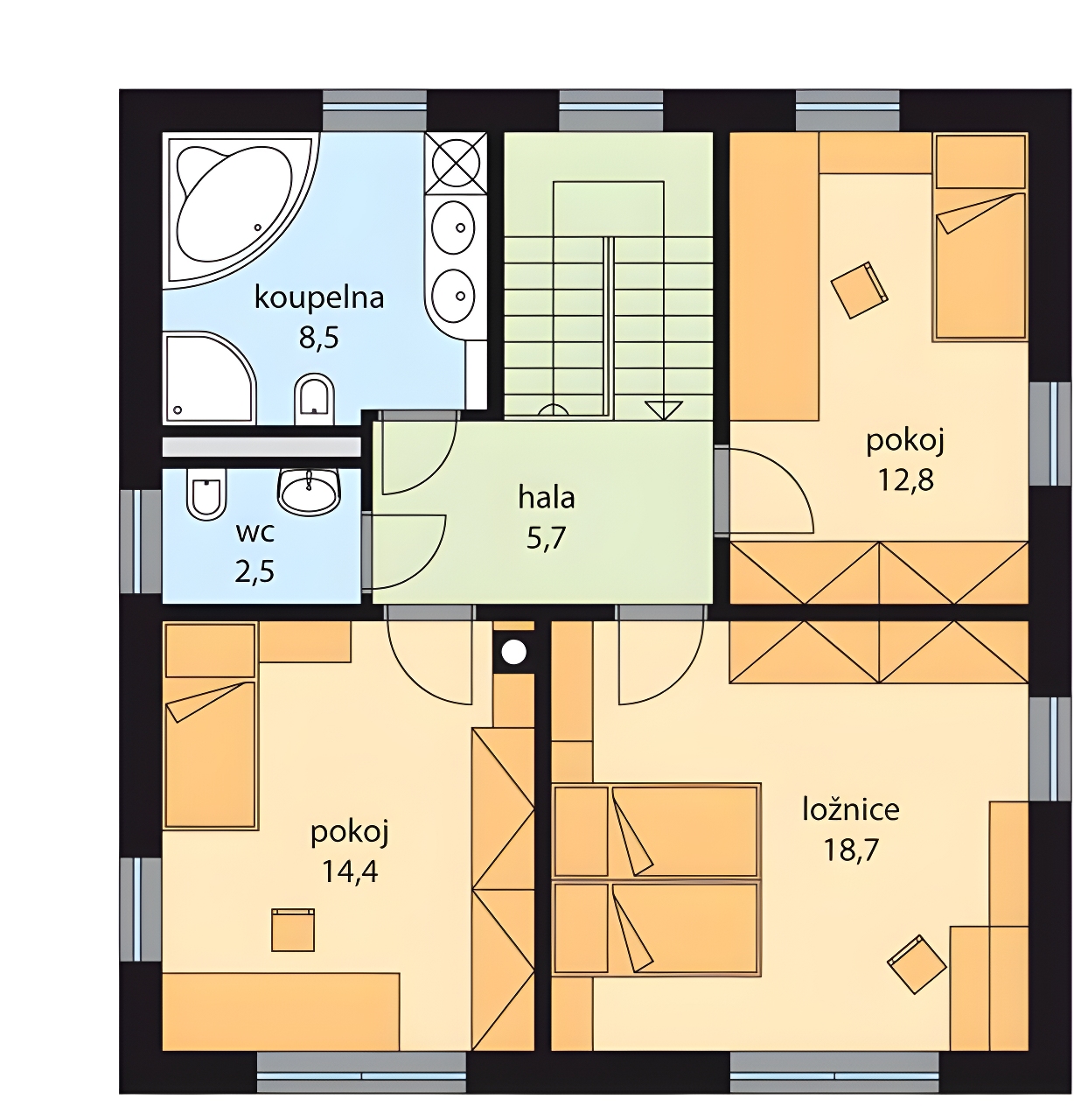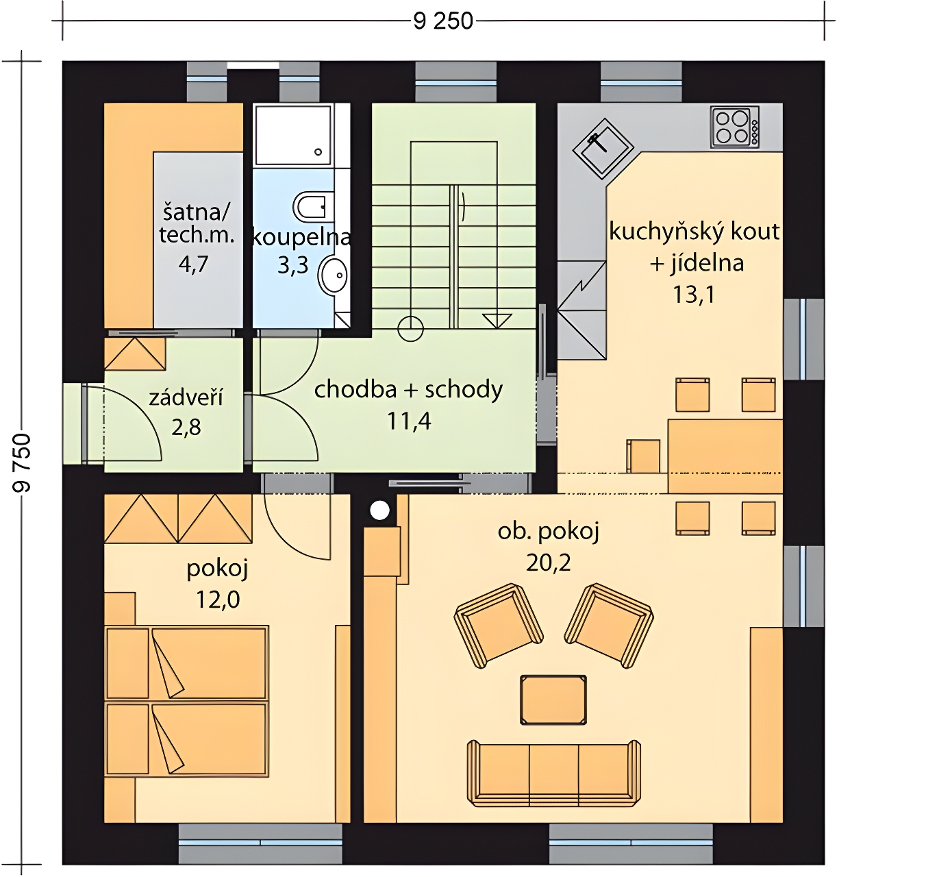 Rodinný dům Dafné je zděný dvoupodlaží dům, kterému mansardová střecha dodává atypický a moderní zjev. Dispozice 5+kk nabízí pohodlné bydlení jedné rodině. Pokoj v přízemí lze využít jako pokoj pro hosty, nebo pracovnu. Vstup na terasu (zahradu) je možný dvoukřídlými dveřmi v obývacím pokoji a pokoji, jednokřídlými dveřmi v kuchyňském a jídelním koutě. Technická místnost umožňuje dovybavit dům technologiemi pro nízkoenergetický standard. Fasáda je řešena obkladovými cihličkami, možná je i varianta se štukovou omítkou dle výběru investora.