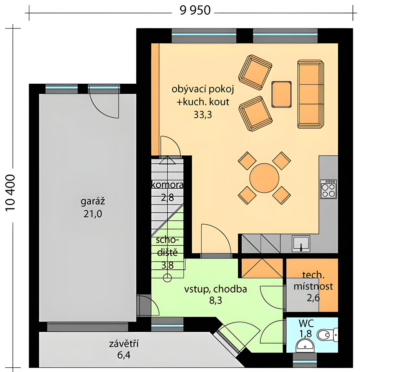 Rodinný dům moderního vzhledu s garáží - DAVID je vhodný pro jednu rodinu. Dispozice a vzhled domu umožňují jej postavit nejen jako samostatně stojící, ale i jako dvojdomek nebo část řadové zástavby. Přízemní tvoří jedna centrální místnost - obývací pokoj s kuchyňským koutem. Klidová část domu je situována do podkroví a tvoří ji ložnice, pokoj a společné hygienické zázemí. Fasáda objektu je tvořena klasickou fasádní omítkou v odstínu dle výběru investora a dřevěným nebo cihelným obkladem. Dům lze postavit i bez garáže, nebo jen s garážovým stáním.