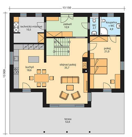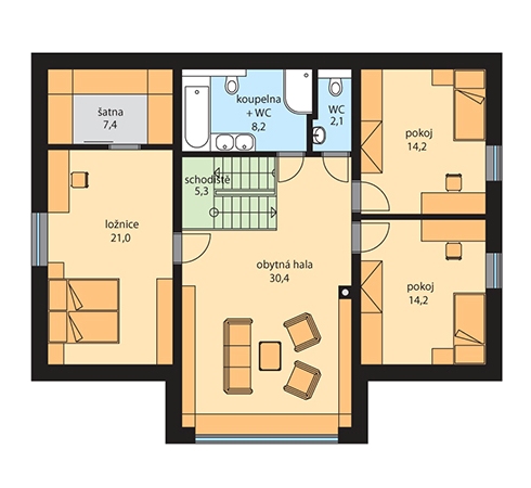 Rodinný dům DONIKA je přízemný dům s podkrovím, jehož dispozice umožní pohodlné bydlení i vícečlenné rodině. Objekt je rešen jako zděná stavba. Jako zdící materiál bude použit cihelný stavební systém. Zastřešení je rešeno dvěmi sedlovými strechami. Ze zádveří se vstupuje přímo do obývacího pokoje s krbem, sousedícího se samostatnou prostornou kuchyní a ložnicí s přilehlou koupelnou s WC. Z obývacího pokoje je přímo vstup na zahradu a schodištěm do podkroví. Tím se vstupí do obytné haly, ze které se vstupuje do obou pokojů a ložnice se samostatnou šatnou. V koupelně se nachází vana, sprchový kout, dvě umyvadla a toaleta. Technická místnost v přízemí umožní dům vybavit technologiemi pro nízkoenergetický standard, má dostatek úložného prostoru a slouží i jako prádelna. Přebudováním ložnice na kuchyň lze v podkroví vybudovat samostatnou bytovou jednotku a dům využít jako vícegenerační.