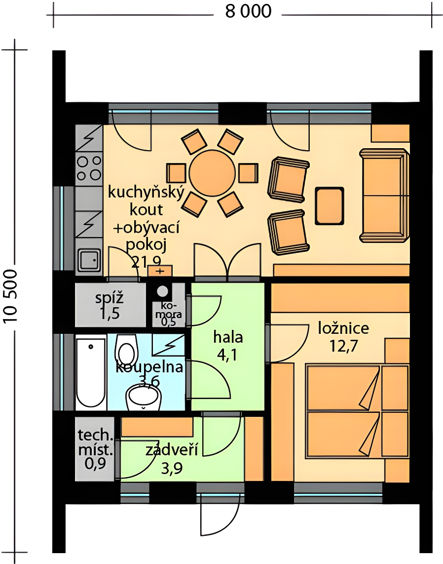 Rodinný dům Dorka je dispozičně jednoduchý dům určený pro bydlení jedné rodiny. Velikostí obytné i užitné plochy patří mezi domy menší velikostní kategorie se sedlovou střechou. Vstup do domu je do zádveří, ze kterého se vchází do haly a technické místnosti. Z haly se vstupuje vpravo do ložnice, vlevo do koupelny s WC, a komory, přímo do obývacího pokoje propojeného s kuchyňským koutem. Vedle kuchyně je malá spíž. Francouzská okna v kuchyni a obývacím pokoji umožňují nejen vstup na terasu, ale hlavně dostatečné osvětlení, proto je vhodné vstup do domu situovat na severní nebo východní stranu. Dům má komín, v obývacím pokoji lze vystavět krb, nebo instalovat krbová kamna.