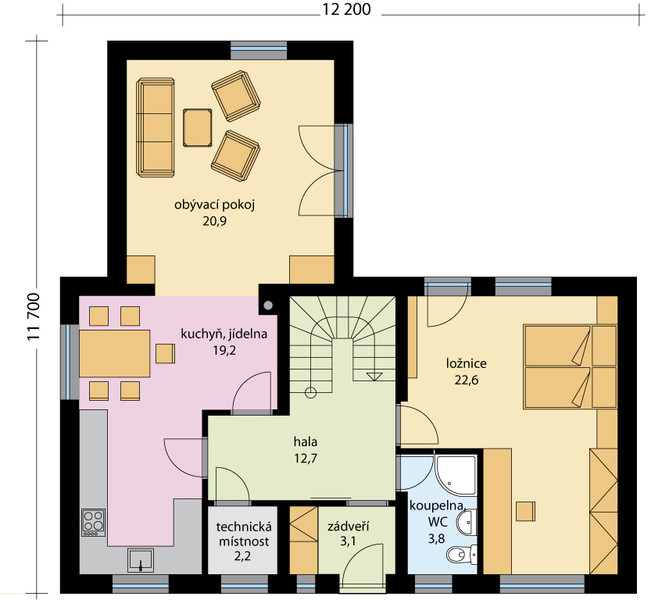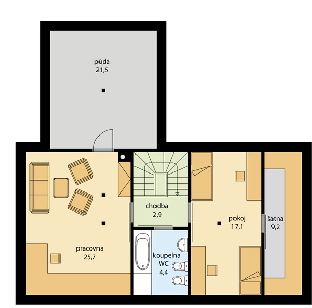 Samostatně stojící rodinný dům s částečně obytným podkrovím, určený pro pohodlné bydlení jedné rodiny. Do domu se vstupuje zádveřím do haly, ze které je přístupna technická místnost, koupelna s wc, kuchyň s jídelnou a ložnice. Obývací pokoj, jídelna a kuchyň jsou propojeny. Z ložnice a obývacího pokoje je vstup na venkovní terasu. V podkroví, které je přístupné schodištěm z haly, je pokoj se šatnou, pracovna a koupelna. V koupelně je vana, umyvadlo, taoleta, bidet. Půdu lze využít jako skladovací prostor. Fasáda domu je navržena z obkladových cihliček, lze ji upravit pouze na omítku.