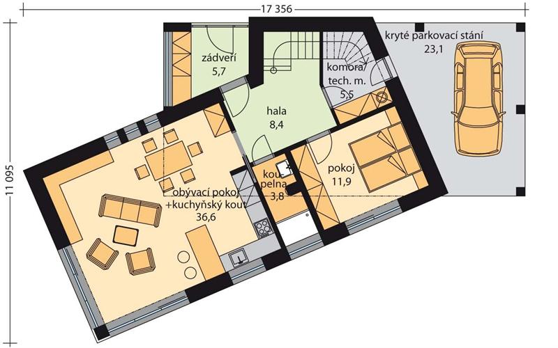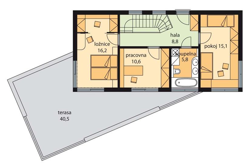 Dvoupodlažní rodinný dům Edmont je netradičního dispozičního uspořádání s krytým parkovacím stáním, určený pro bydlení vícečlenné rodiny. Přes zádveří se vstupuje do haly, která propojuje místnosti v 1.NP-obývací pokoj s jídelním a kuchyňským koutem, ložnicí, s přilehlou koupelnou. Ložnici lze využít jako pracovnu, pokoj pro hosty, s možností dobudovaní samostatného vstupu zvenčí. Z obývacího pokoje i ložnice je přístup na terasu. Střecha obývacího pokoje tvoří terasu v patře. Do 2. patra se vstupuje schodištěm z haly, kde je další ložnice, pokoj, pracovna a koupelna. Kryté parkovací stání je propojeno s vnitřní halou přes komoru.