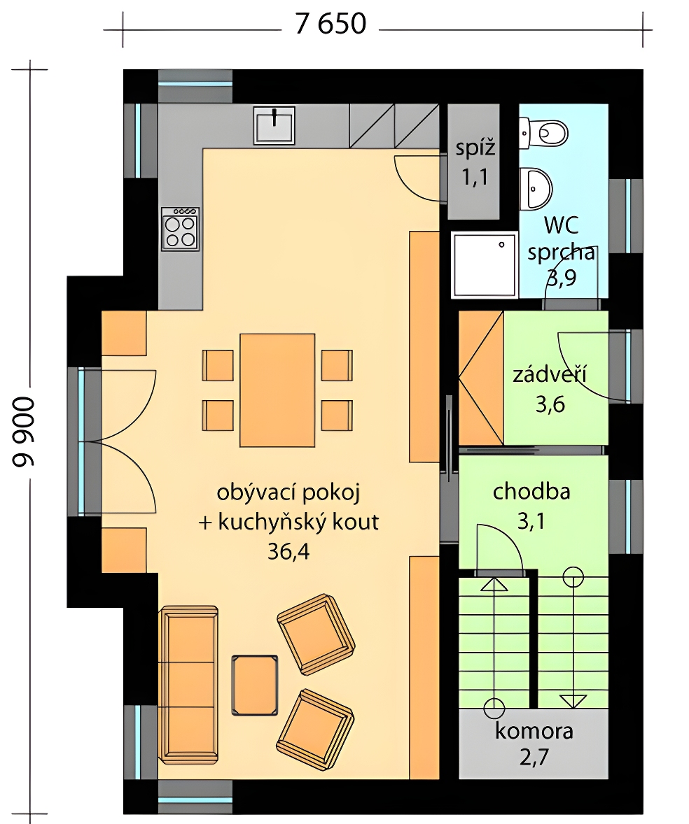 Rodinný dům ELVIS představuje menší přízemní rodinný dům s obytným podkrovím tradičního vzhledu, zastřešeného sedlovou střechou, jehož dispozice umožní bydlení jedné rodině. Ze zádveří je vstup do chodby a obývacího pokoje s jídelním a kuchyňským koutem. Součástí kuchyňského koutu je i spíž. Vstup na zahradu je prosklenými dvoukřídlými dveřmi v jídelním koutě. Využitý je i prostor pod schody, kde se nachází malá komora. Dispozice podkroví nabízí dvě ložnice, koupelnu a šatnu. Fasáda objektu je řešena obkladovými cihličkami, může být řešena jen štukovou omítkou.