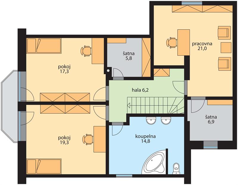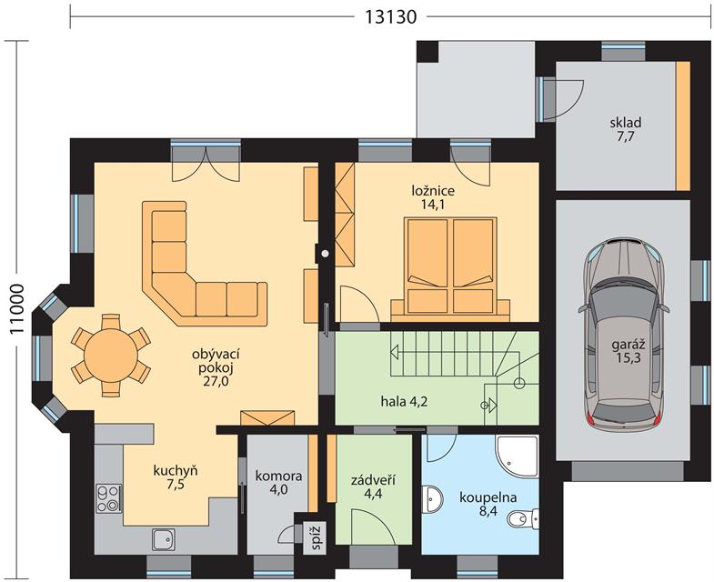 Rodinný dům Esma je klasický podkrovní dům s garáží vhodný do městské zástavby i na venkov. Počet místností 5+1. V přízemí se nachází obývací pokoj s jídelním koutem a kuchyní a ložnice. Příjemným prvkem v nepříznivém počasí je zastřešená terasa, na kterou se vstupuje z ložnice i obývacího pokoje. V podkroví jsou dva dětské pokoje a pracovna /ev.další ložnice/ s vlastní šatnou. Přes nevelké celkové rozměry nabízí dispozice nadstandardně dvě koupelny, dvě šatny, komoru a sklad/ technickou místnost/, který umožňuje tento dům vybavit technologiemi i pro mimořádně úsporný standard. Dům je typově vhodný do rovinného i mírně svažitého terénu.