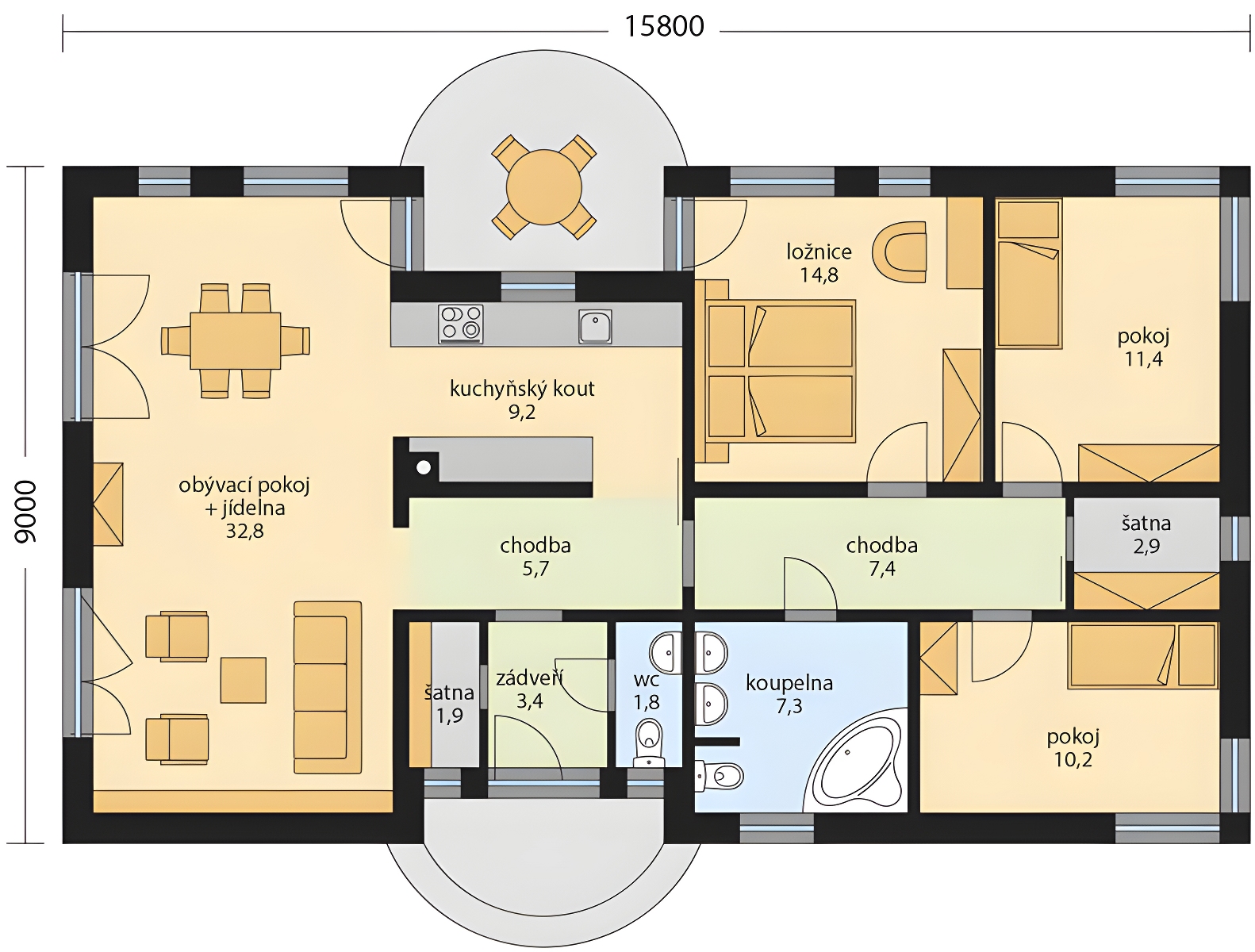 Rodinný dům Eunice o velikosti bytové jednotky 4+kk je vhodný pro užívání jedné rodiny. Dispozice zahrnuje prostorný obývací pokoj s jídelnou, propojený s kuchyňským koutem, ložnici, dva pokoje, dvě šatny, WC a koupelnu. Obývací pokoj je opatřen krbovými kamny. Francouzská okna poskytují nejen prosvětlení interiéru, ale umožňují i vstup na terasu. V koupelně je vana, dvě umyvadla, toaleta a místo pro pračku, ev. sprchový kout. Totožnou dispozici v provedení se sedlovou střechou nabízíme u RD Robin.
