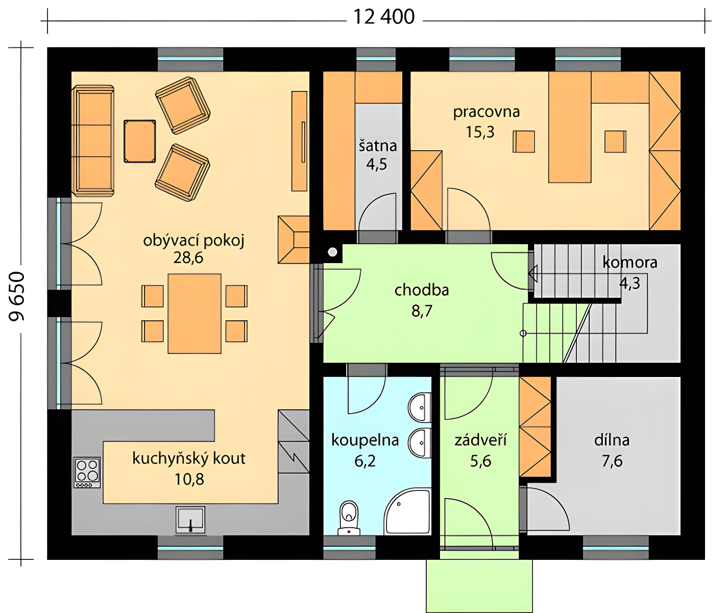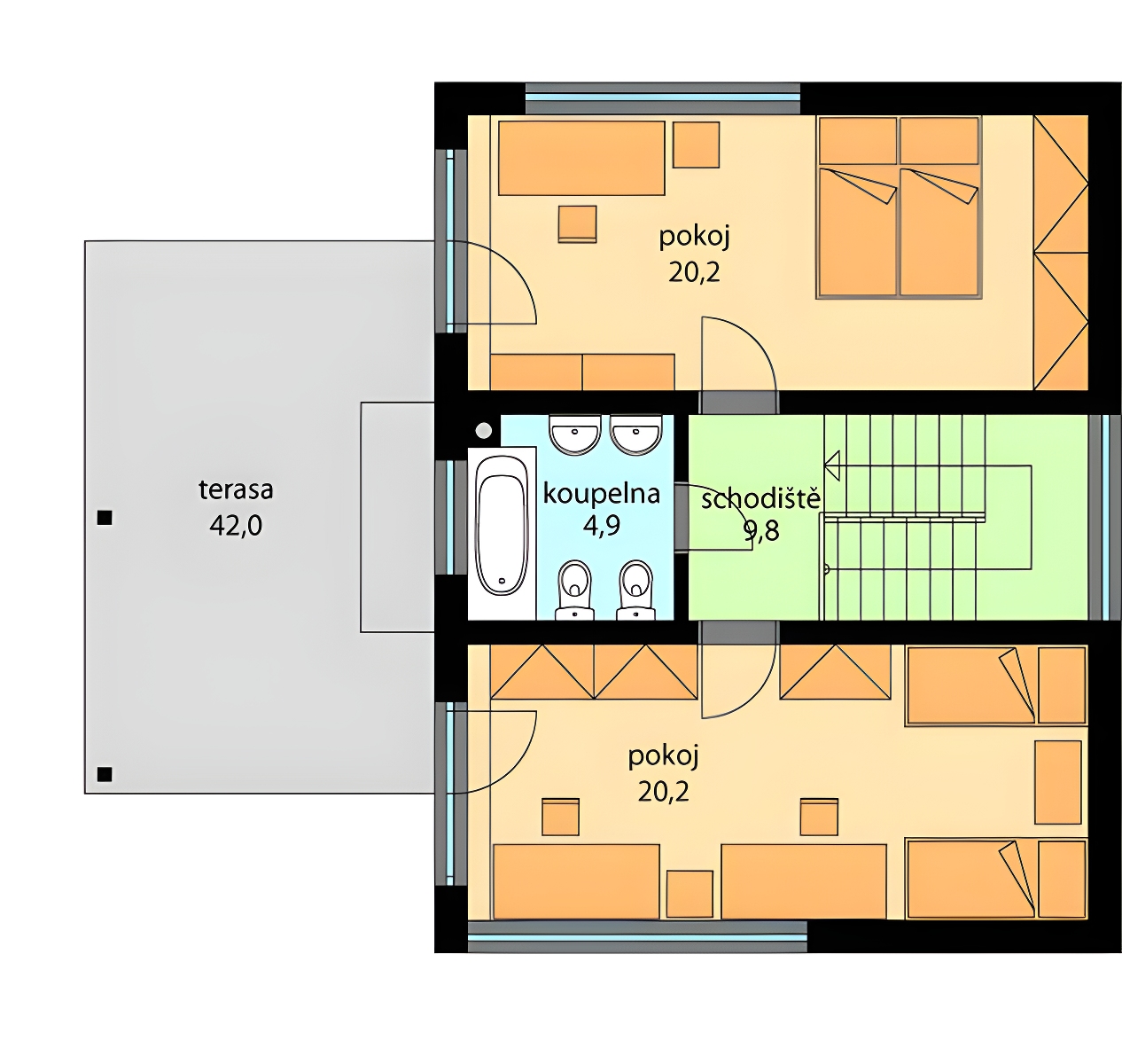 Rodinný dům Fabián je patrový dům moderního vzhledu s plochou střechou a prostornou obytnou terasou dispozičně řešený pro bydlení jedné rodiny. V přízemí je velký obytný prostor s kuchyňským koutem, pracovna, prostorná šatna, koupelna a technická místnost (dílna). V patře, které je konstrukčně řešeno jako dřevěný sendvič jsou dva pokoje a koupelna. Z obou pokojů je přístup na velkou terasu, která je částečně řešena jako zelená střecha. Při vhodném umístění objektu na pozemek lze využít jako nízkoenergetický či pasivní dům.