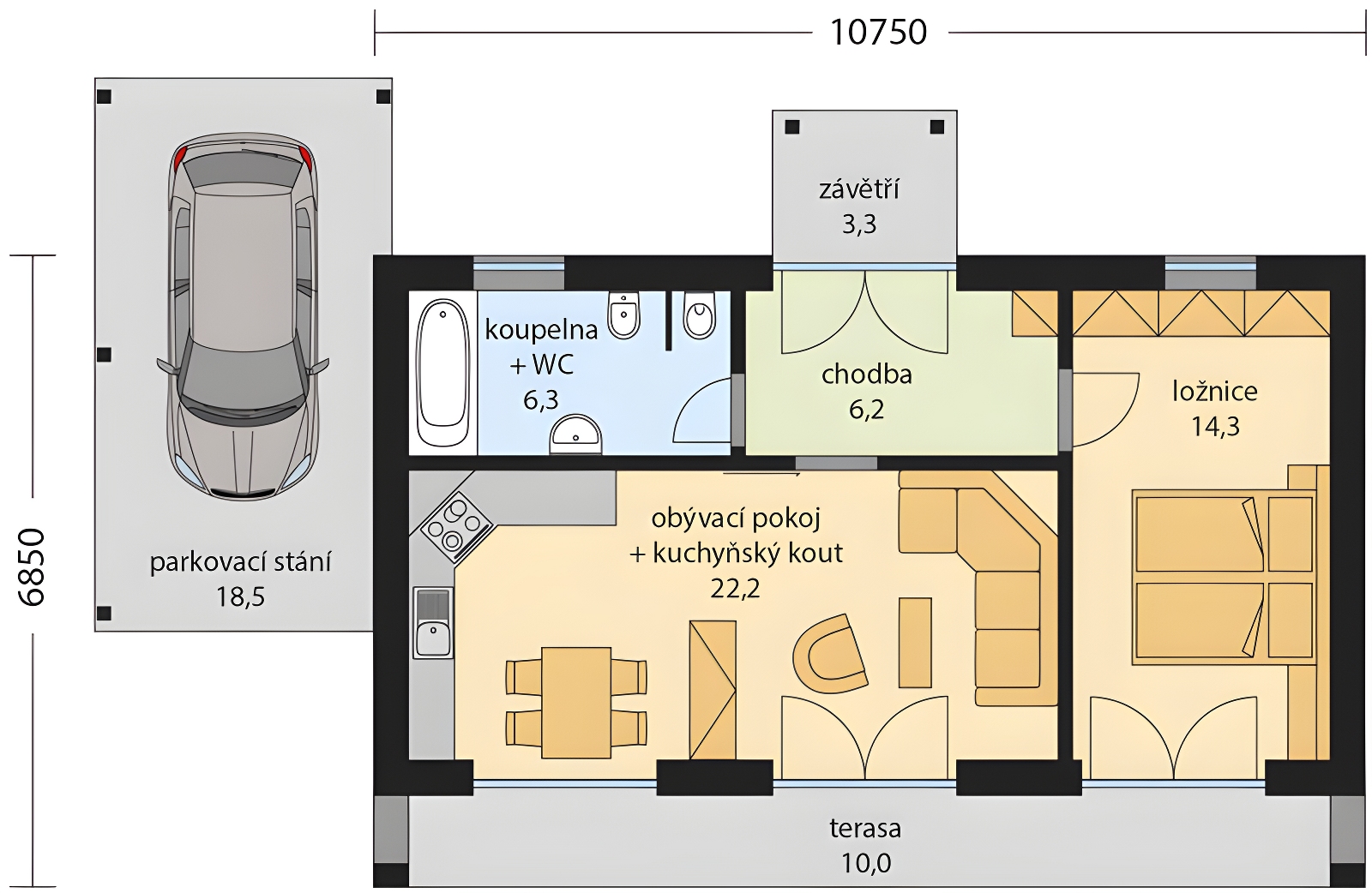 Rodinný dům JANA je menší přízemní rodinný dům s parkovacím stáním. Jednoduchá dispozice - obývací pokoj propojený s kuchyňským koutem, ložnice a koupelna, umožní bydlení 2 členné rodině. Krytým závětřím se vstoupí do chodby, ze které je vstup do všech místností. Z obývacího pokoje i ložnice je vstup na terasu, která je částečně zastřešena. V ložnici lze vybudovat samostatnou šatnu.