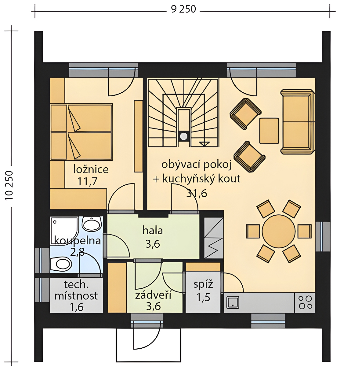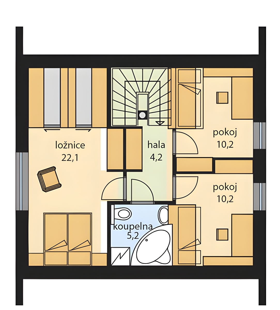Rodinný dům Jarouš je menší rodinný dům s plně využitým podkrovím, určený pro bydlení jedné rodiny. Do domu se vstupuje zádveřím do haly propojující místnosti v přízemí - obývací pokoj s kuchyňským koutem, ložnici a koupelnu sousedící s technickou místností. Z obývacího pokoje i ložnice se vstupuje na terasu. Ložnice může sloužit jako pracovna, pokoj pro hosty nebo více účelová místnost. Schodištěm v obývacím pokoji se vstupuje do podkroví, prostor pod schody je využitý pro umístění krbových kamen. V podkroví je prostorná druhá ložnice se šatnou, dva dětské pokoje a malá koupelna s toaletou, umyvadlem a vanou.