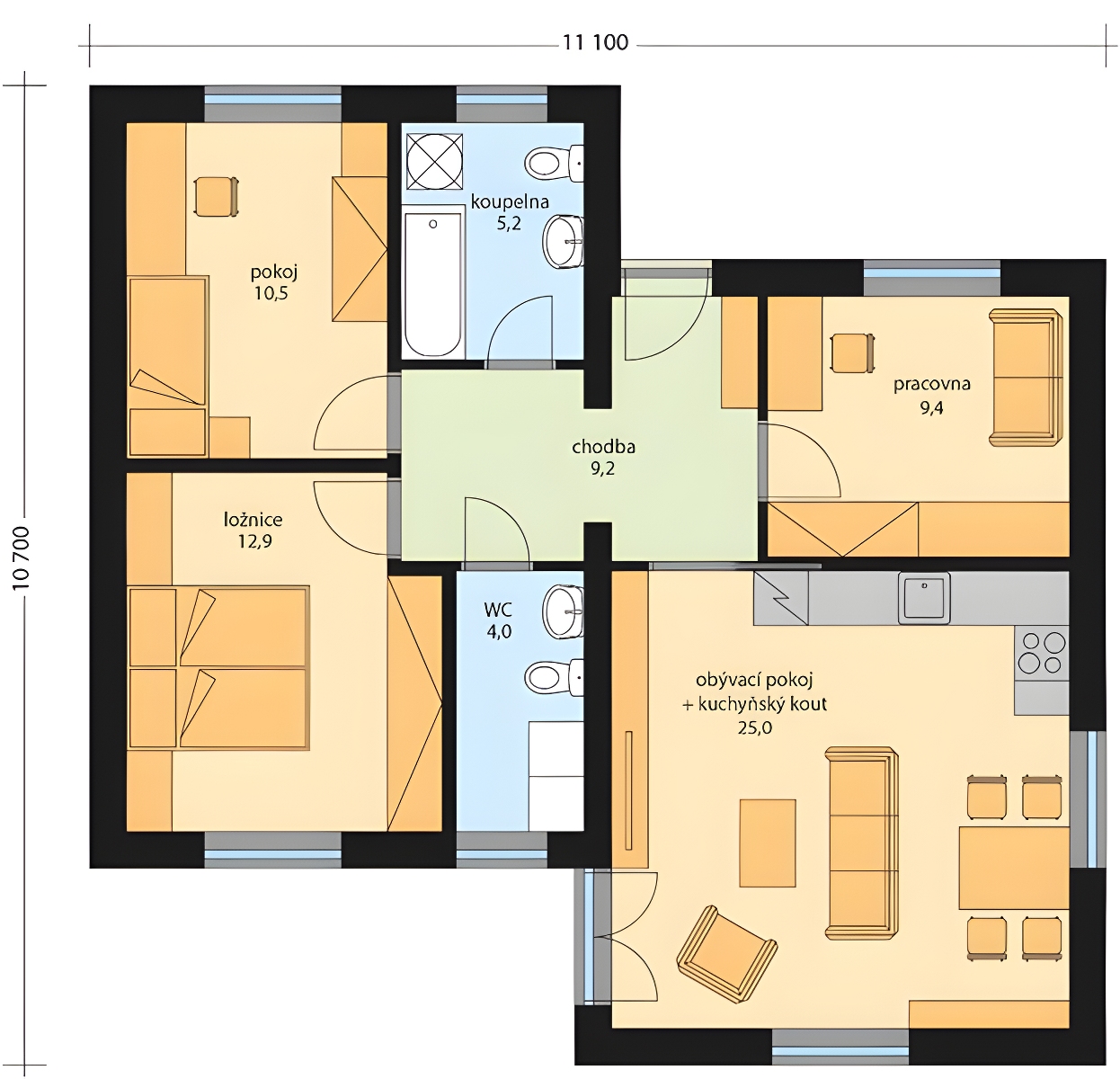 Rodinný dům Jituška je menší bungalov s plochou střechou, jehož dispozice je tvořena dvěma na sebe navazujícími obdélníky, které dům rozdělují na klidovou a obytnou část. Krytým závětřím se vstoupí do chodby, propojující všechny místnosti. Přímo se vstoupí do obývacího pokoje propojeného s kuchyňským koutem, na něj navazuje pracovna, která může sloužit jako pokoj pro hosta, komora...V klidové části domu je ložnice a pokoj dětí. Přes balkonové dveře se z obývacího pokoje vstupuje na terasu. Prostorné WC slouží z části i jako technická místnost, kde je možné umístit kromě kotle, pračku, sušičku... Fasáda je řešena  klasickou fasádní omítkou-barevné provedení dle výběru investora.