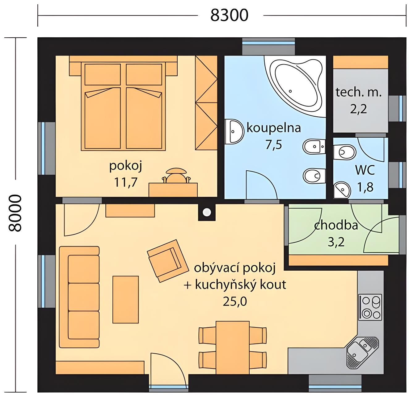 Rodinný dům JONÁŠ je menší přízemní dům, určený pro bydlení jedné rodiny. Dispozičním řešením a velikostí obytné i užitné plochy patří mezi domy menší velikostní kategorie se 2 obytnými místnostmi – obývací pokoj propojený s kuchyňským koutem a ložnice. Vstup do domu je do chodby, ze které je vstup do obývacího pokoje a na WC s technickou místností. Obývací pokoj a kuchyňský kout nejsou odděleny. Z obývacího pokoje je vstup do koupelny a ložnice. Balkonovými dveřmi je přístupna venkovní terasa. Dům má komín, v obývacím pokoji lze umístit krb nebo krbová kamna.