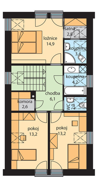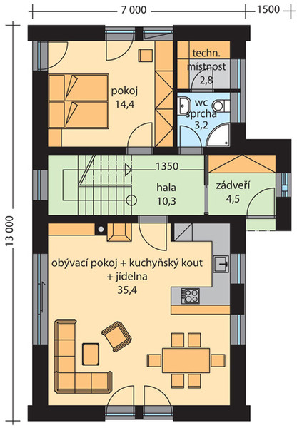 U rodinného domu KATRIN nabízíme na obdélníkovém půdorysu dispozici s dvěma pokoji v přízemí a třemi pokoji a dvěma koupelnami v podkroví, která umožní pohodlné bydlení i vícečlenné rodině. Obývací pokoj je propojený s kuchyňským koutem. Balkonové dveře v obývacím pokoji umožňují přímé propojení interiéru s exteriérem, tedy obývacího pokoje se zahradou. Pokoj v přízemí lze díky samostatnému přístupu zvenčí využít i jako pohodlnou pracovnu, nebo pokoj pro hosty. Jednoduchý půdorys, bezpřesahová střecha, obložení fasády dřevem a cihličkami zajišťují domu modernější vzhled.