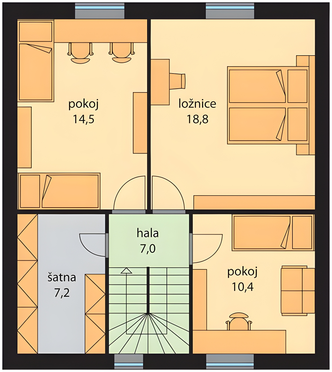 Klaudie je klasický rodinný dům s plně využitým podkrovím, určený pro bydlení jedné rodiny. V přízemí se nachází obývací pokoj propojený s jídelnou a kuchyňským koutem, ze kterého je přístup na venkovní terasu. V podkroví je ložnice, dva dětské pokoje a prostorná šatna.