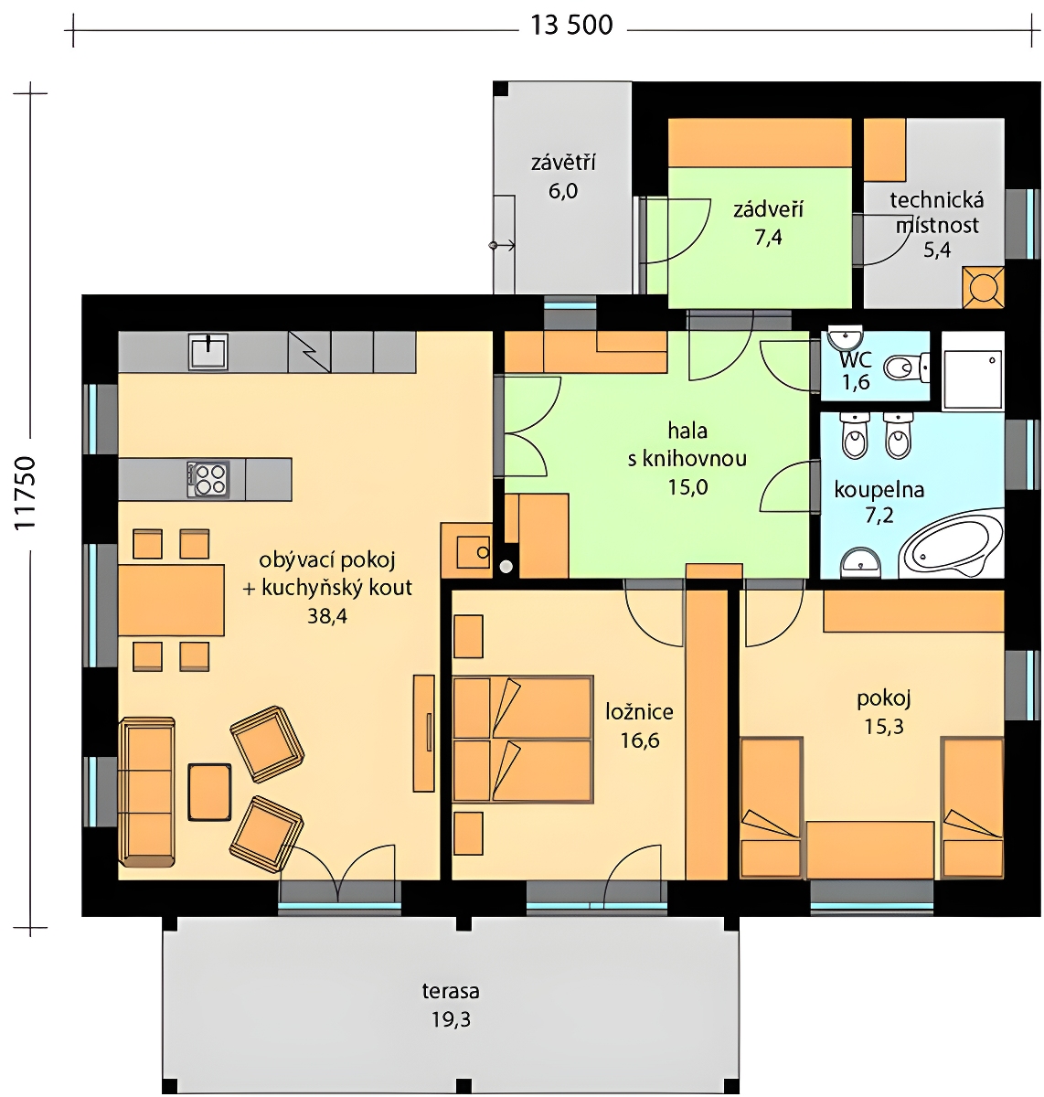 Rodinný dům Kocián je přízemní dům moderního vzhledu dispozičně řešený pro bydlení 4 osob. Dům je navržen tak, aby se v něm všichni členové domácnosti cítili dobře. Ze zádveří se dostanete do krásné a prostorné haly, odkud máte přístup do všech obytných místností domu. Moderně navržený obývací pokoj s kuchyňskou linkou je opatřen krbovými kamny a poskytuje dostatek prostoru pro celou rodinu. V ložnici i v obývacím pokoji jsou navrženy balkonové dveře s východem přímo na zahradní terasu s pergolou chránící před sluncem. Dětský pokoj má okna na dvě světové strany. Koupelna je zařízena jak moderním sprchovým koutem, tak klasickou vanou. Technická místnost s pračkou je oddělena od běžného chodu domácnosti. Při vhodném umístění objektu na pozemek lze využít jako nízkoenergetický či pasivní dům.
