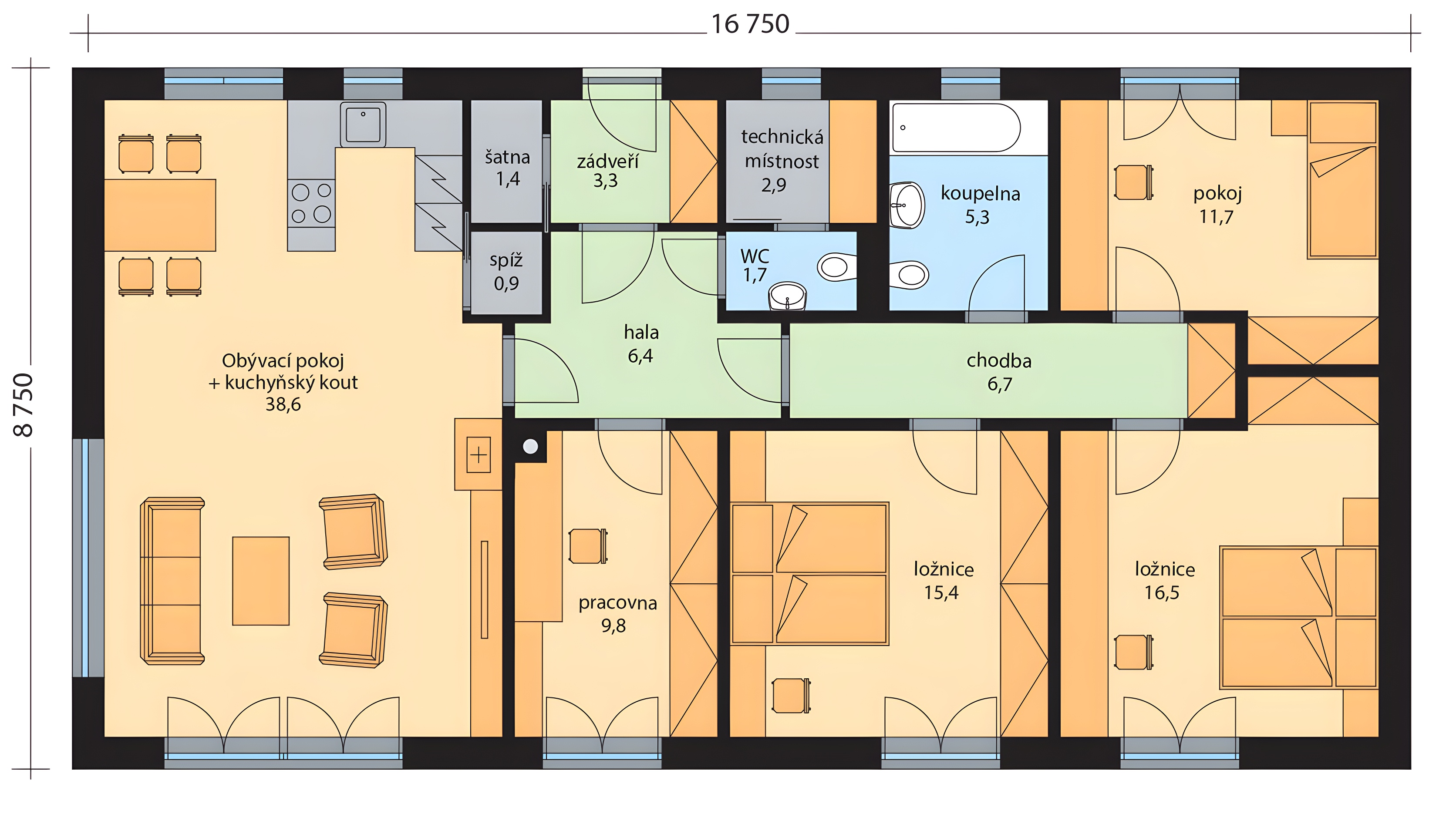 Rodinný dům Lucián je bungalov vhodný na rozlehlejší pozemek, jehož dispozice umožní pohodlné bydlení vícečlenné rodině. Krytým závětřím se vstoupí přímo do haly a chodby, které propojují všechny místnosti – obývací pokoj s kuchyňským koutem, ložnice, pokoj dětí, pracovnu. Obytné místnosti s francouzskými okny umožňují vstup na terasu. Šatna, spíž a technická místnost zajišťují nejen dostatek úložného prostoru, ale umožní v případě požadavku investora dovybavit dům technologiemi pro nízkoenergetický standart. V obývacím pokoji je komín s krbovými kamny.