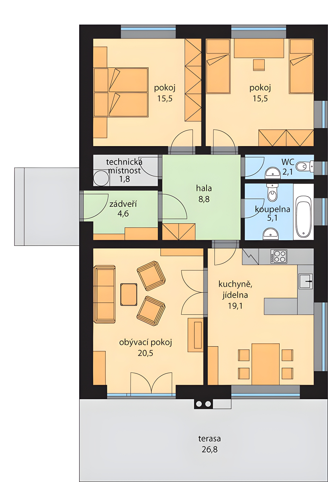 Rodinný dům Mariánka je přízemní dům moderního vzhledu dispozičně řešený pro bydlení 4 osob. Ze zádveří se dostanete do prostorné haly, odkud máte přístup do všech místností domu-samostatné kuchyně s jídelnou, obývacího pokoje, pokoje, ložnice, koupelny, WC a technické místnosti, která může sloužit jako komora. Moderní obývací pokoj je opatřen krbovými kamny a jsou zde navrženy balkonové dveře vedoucí na terasu. Dům před přehřátím z jižní strany chrání pergola. Tento díky minimu otvorů na sever je možné postavit jako nízkoenergetický.