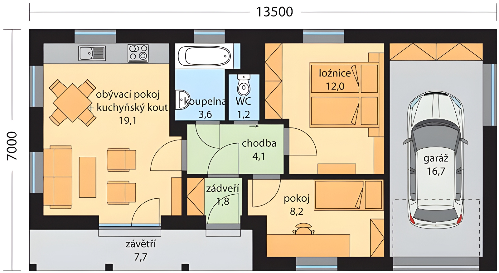 Rodinný dům MARIKA je dispozičně jednoduchý dům s garáží určený pro bydlení jedné rodiny. Velikostí obytné i užitné plochy patří mezi domy menší velikostní kategorie s valbovou střechou. Vstup do domu je zádveřím, ze kterého je vstup do chodby, ze které se vchází do obývacího pokoje, ložnice, pokoje, koupelny a WC. Obývací pokoj propojený s kuchyňským koutem je opatřen krbovými kamny. Kryté závětří umožňuje pohodlný vstup do domu, ale tvoří i zastřešenou terasu, na kterou se vstupuje z obývacího pokoje.