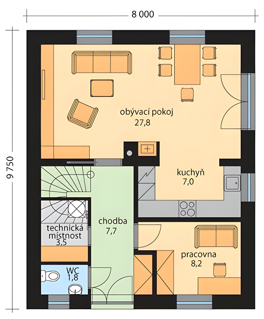 Rodinný dům Marta je menší domek s plně využitým podkrovím, určený pro bydlení jedné rodiny. Dispozičně je dům rozdělený na denní část s obývacím pokojem a pracovnou v přízemí a noční část v podkroví. Obývací pokoj s jídelním koutem vytvářejí jeden prostor s výstupem na terasu. Kuchyň je řešena odděleně. Tepelnou pohodu v obývacím pokoji může zajistit krb, nebo krbová kamna. Po schodišti se z chodby dostaneme do podkroví, které tvoří tři obytné místnosti-ložnice a dva pokoje a koupelna s WC. Technická místnost v přízemí umožní v případě požadavku dovybavit dům technologiemi pro nízkoenergetický standart, nebo může sloužit částečně jako šatna nebo komora. Barevnou kombinaci fasády a její odstíny řešíme dle přání investora.