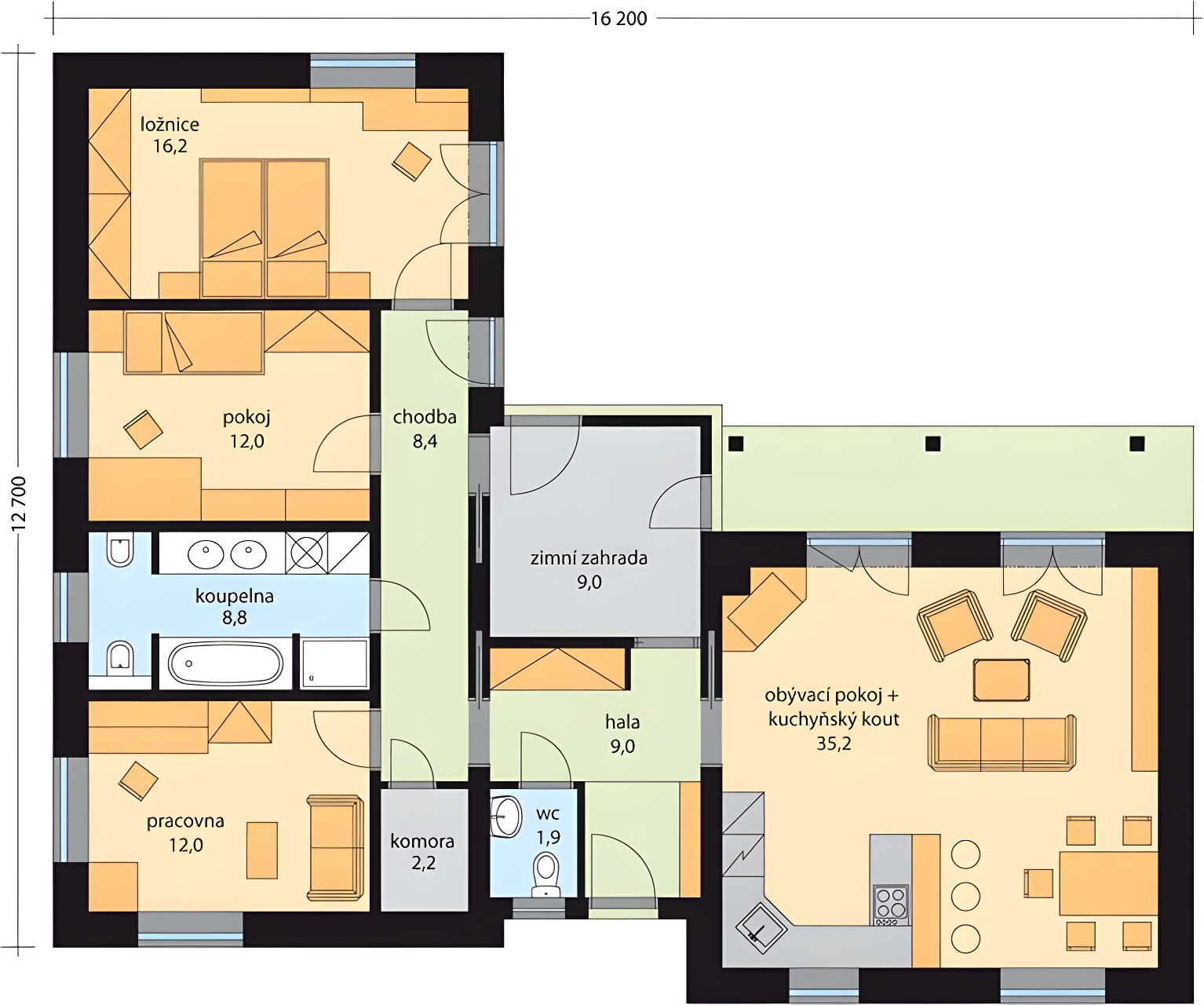 Rodinný dům Máša je přízemní dům vhodný na rozlehlejší pozemek,určený k bydlení jedné rodiny. Dům tvoří 2 celky propojeny halou se zimní zahradou. V pravé čtvercové části je samostatně obývací pokoj s kuchyňským koutem. Francouzská okna poskytují nejen dostatečné prosvětlení, ale i propojení interiéru s exteriérem. V levé obdélnikové části, je ložnice se vstupem na terasu a další dva pokoje (možnost využití jako dětský pokoj nebo pracovna). V prostorné koupelně je vana, sprchový kout, 2 umyvadla, toaleta, bidet, místo pro pračku a sušičku. Komín v obývacím pokoji umožní instalovat krbová kamna, nebo vystavět krb.