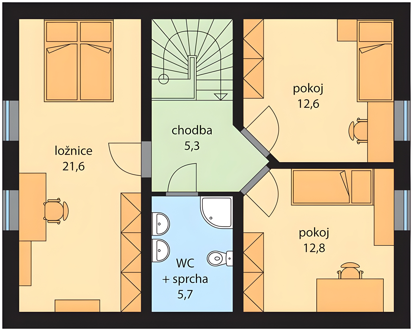 Rodinný dům Matylda je navržený pro bydlení jedné i vícečlenné rodiny. Dispozice nabízí 5 místností s kuchyňským koutem. Dům lze stavět etapově, kdy v přízemí, které zahrnuje kromě obývacího pokoje i prostornou koupelnu se místo pracovny vybuduje ložnice a bude tvořit tak samostatnou bytovou jednotku. Prostor schodiště může dočasně sloužit jako komora. Podkroví, kde jsou navrženy dva pokoje a ložnice, lze dobudovat ve 2.etapě. Sedlová střecha, jednoduchý půdorys a fasáda částečně obložená palubkami – to vše tvoří výraz klasického venkovského domu hodící se do jakékoliv zástavby.
