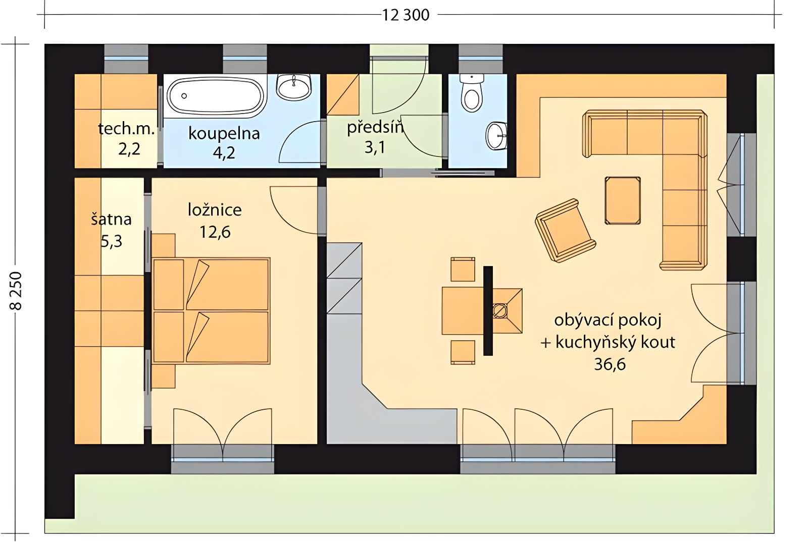 Rodinný dům Maxík je přízemní dům moderního vzhledu dispozičně řešený pro bydlení 2 osob. Obývací pokoj, oddělený od kuchyňského koutu krátkou příčkou s krbem,nebo krbovými kamny, je dominantou celého domu. Z obývacího pokoje se vstupuje do ložnice se samostatnou šatnou. Oba pokoje jsou osazeny francouzskými okny umožňujícími vstup na terasu. Střešní konstrukce je předsazena cca 90 cm, což snižuje přehřátí pokojů sluncem. Rozšířenou variantou je dvoupodlažní RD MAX.
