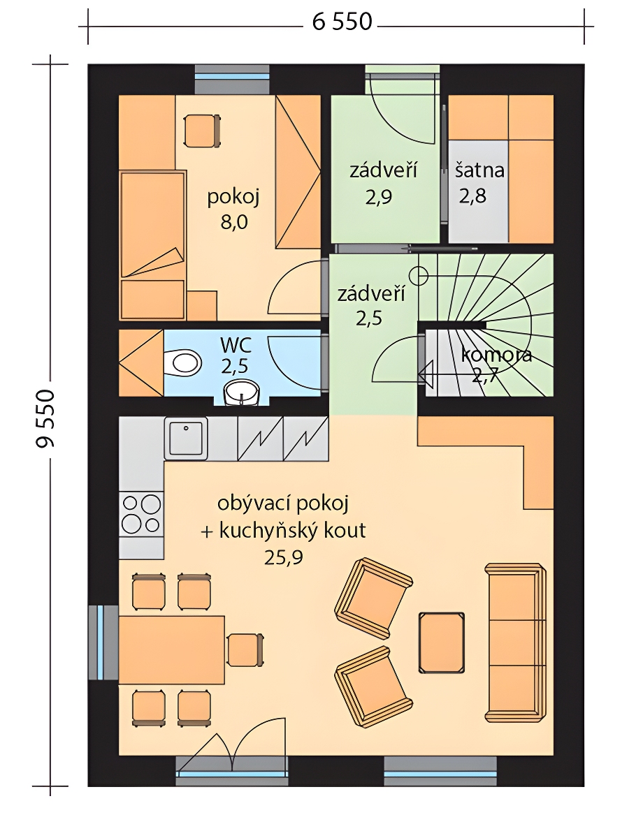 Rodinný dům Merilyn je menší domek s plně využitým podkrovím, určený pro bydlení jedné rodiny. Dispozičně je dům rozdělený na denní část s obývacím pokojem a pokojem v přízemí a noční část v podkroví. Obývací pokoj s kuchyňským koutem vytvářejí jeden prostor s výstupem na terasu. Po schodišti se z chodby dostaneme do podkroví, které tvoří tři obytné místnosti-ložnice a dva pokoje a koupelna s WC. Šatna a komora pod schody jak v přízemí tak a i v podkroví zajistí dostatek úložného prostoru. Barevnou kombinaci fasády a její odstíny řešíme dle přání investora. V případě požadavku lze doprojektovat komín-tepelnou pohodu v obývacím pokoji může zajistit krb, nebo krbová kamna.