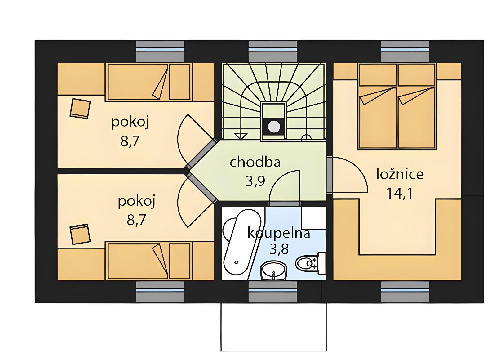Rodinný dům MINKA je moderní menší dvoupodlažní rodinný dům, kterého dispozice umožňuje pohodlné bydlení jedné rodině. Přes halu se vstoupí rovnou do obytného prostoru, kde schodiště do 2.NP rozděluje dům na dvě poloviny. Vpravo je jídelna s kuchyňským koutem s malou spíží a WC (to je přístupné z haly), vlevo obývací pokoj. Obývací pokoj je opatřen krbovými kamny. Francouzská okna ve všech obytných místnostech umožňují nejen propojení interiéru s exteriérem, ale hlavně dostatečné osvětlení. V 2.NP se nachází klidová část domu-ložnice, dva pokoje a koupelna s vanou, umyvadlem a WC.