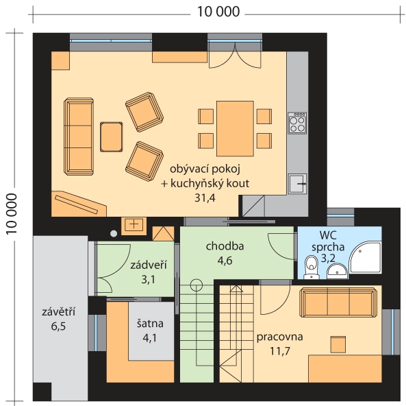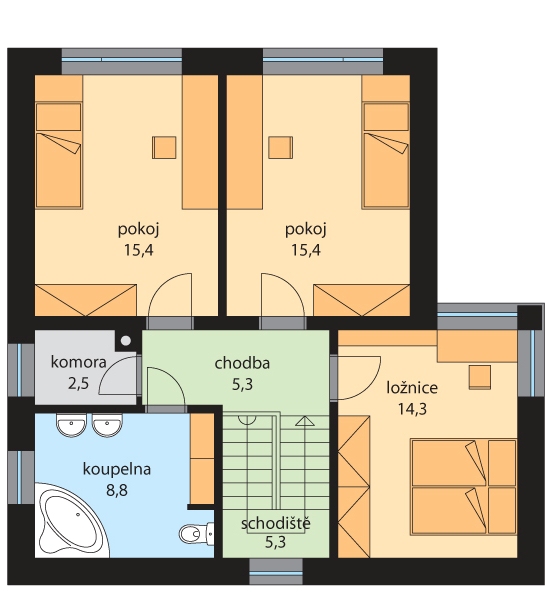 Rodinný dům Miron je dvoupodlažní modernější dům, jehož dispozice nabízí pohodlné bydlení jedné rodině. V 1.NP se nachází obytná část domu - obývací pokoj s kuchyňským koutem a pracovna, kterou lze využít jako pokoj pro hosty nebo další menší ložnici. Nedílnou součástí zádveří je i prostorná šatna. Na terasu se vstupuje jak z obývacího pokoje, tak i z kuchyňského koutu. V 2.NP je klidová část domu, kde se nachází ložnice rodičů a dva pokoje dětí. Fasáda je řešena kombinací omítky a obkladových cihliček.