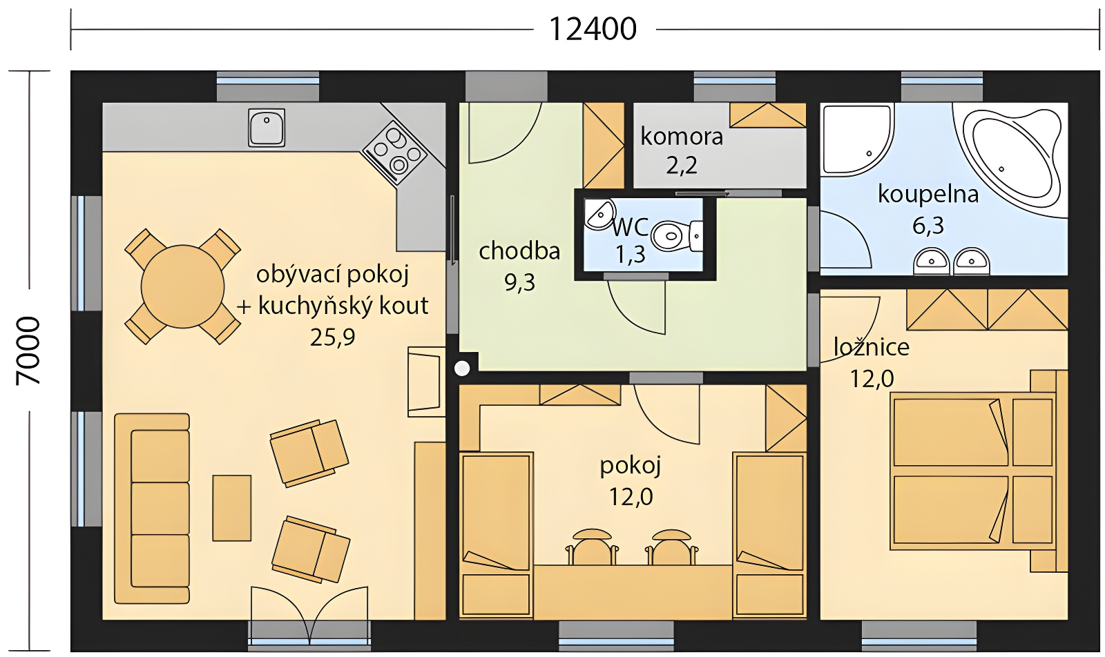 Rodinný dům Nela je malý přízemní dům určený k bydlení jedné rodiny. Jednoduchá dispozice - obývací pokoj propojený s kuchyňským koutem, ložnice, dětský pokoj a koupelna, wc, komora. V obývacím pokoji je krb, nebo krbová kamna. Z obývacího pokoje je vstup na venkovní terasu. Dům je typově vhodný do rovinného i mírně svažitého terénu.