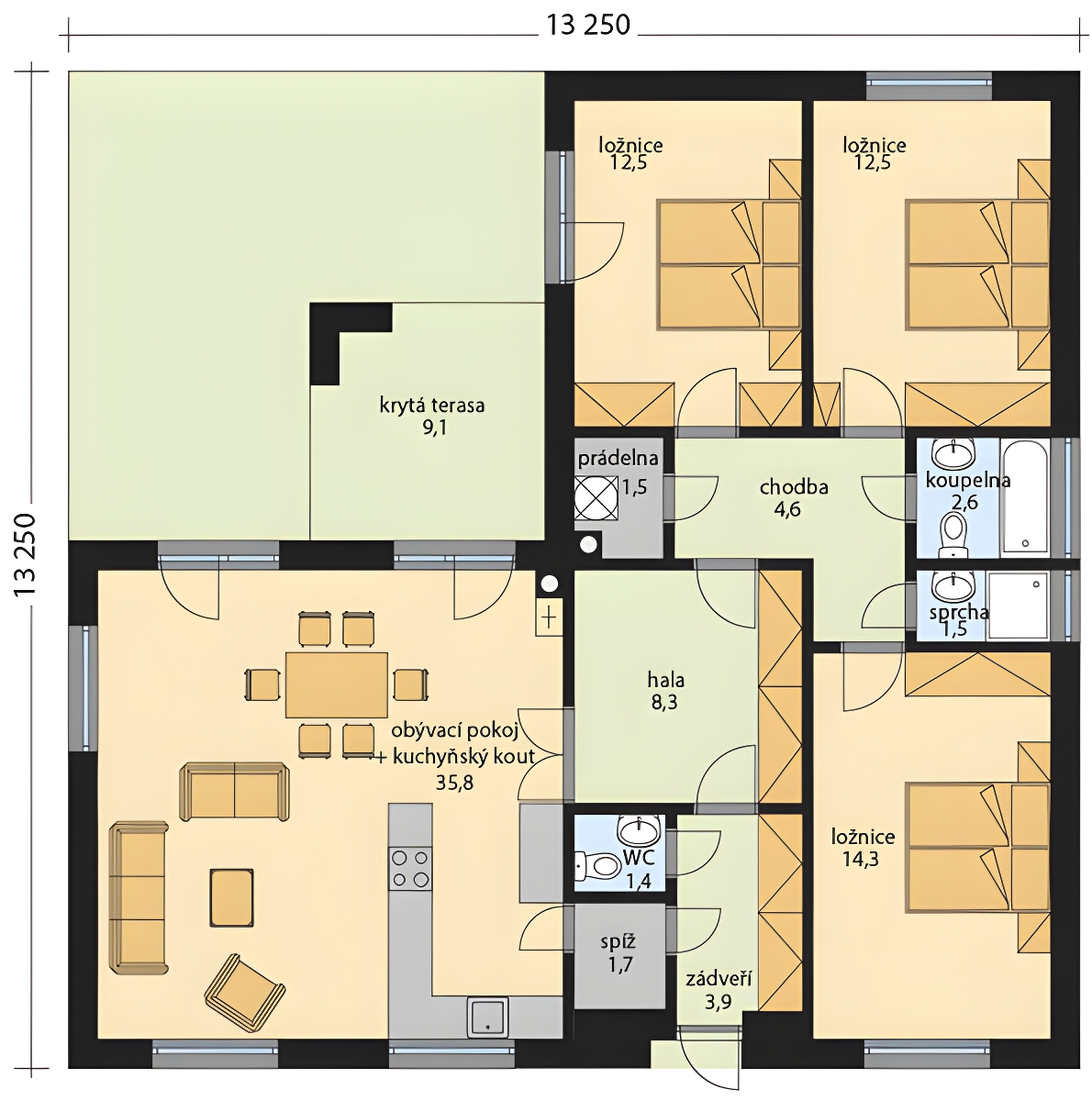 Rodinný dům Petr je zděný bungalov zastřešený valbovou střechou určený pro více člennou rodinu. Přes zádveří se vstupuje do haly, která propojuje všechny místnosti. Vlevo se vstupuje do obývacího pokoje s kuchyňským koutem. Levá část domu je klidová a tvoří ji tři ložnice, prádelna, koupelna a sprcha. Prostorná hala s vestavěnými skříněmi nabízí dostatek úložného protoru. Z obývacího pokoje, kuchyně a ložnice je prosklenými dvoukřídlými dveřmi vstup na terasu, která je částečně zastřešena a na zahradu.