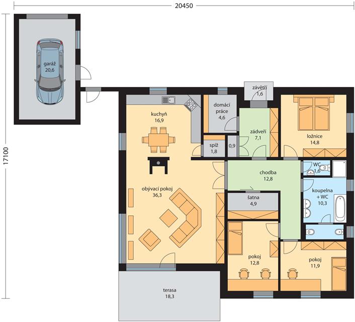 Rodinný dům Robert je klasický zděný bungalov dům zastřešený valbovou střechou se sklonem 30°, jehož úsporná dispozice zajišťuje maximální využití půdorysné plochy. Dům je ideální pro čtyřčlennou rodinu. Dispozice nabízí kromě obývacího pokoje s kuchyní, ložnice, pokojů dětí a koupelny i šatnu a technickou místnost, která umožňuje tento dům vybavit technologiemi pro nízkoenergetický standard. Z obývacího pokoje je přístup na venkovní terasu. Dům je možné umístit na rovinnatý i mírně svažitý terén.