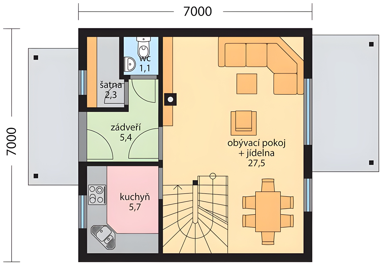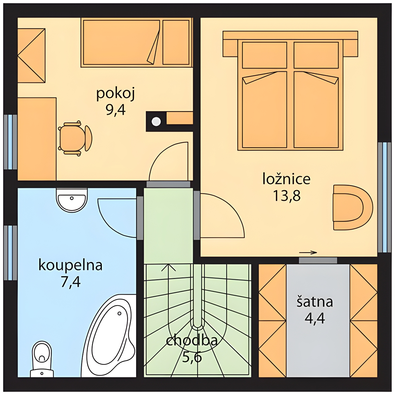 Rodinný dům Roland je menší klasický přízemní dům s obytným podkrovím, určený pro bydlení jedné rodiny. Do domu se vstupuje zádveřím přímo do obývacího pokoje, který tvoří centrální prostor v přízemí. Kuchyň je oddělena. Z obývacího pokoje je přístupna terasa, kde může být pro zastínení navržena pergola. V přízemí se nachází ještě malá šatna a samostatné WC. Po schodišti z obývacího pokoje je přístupné podkroví, kde je situován pokoj, ložnice s přilehlou šatnou a koupelna. Dům nabízíme i ve variantě dřevostavba - viz. dům ROLAND - D.