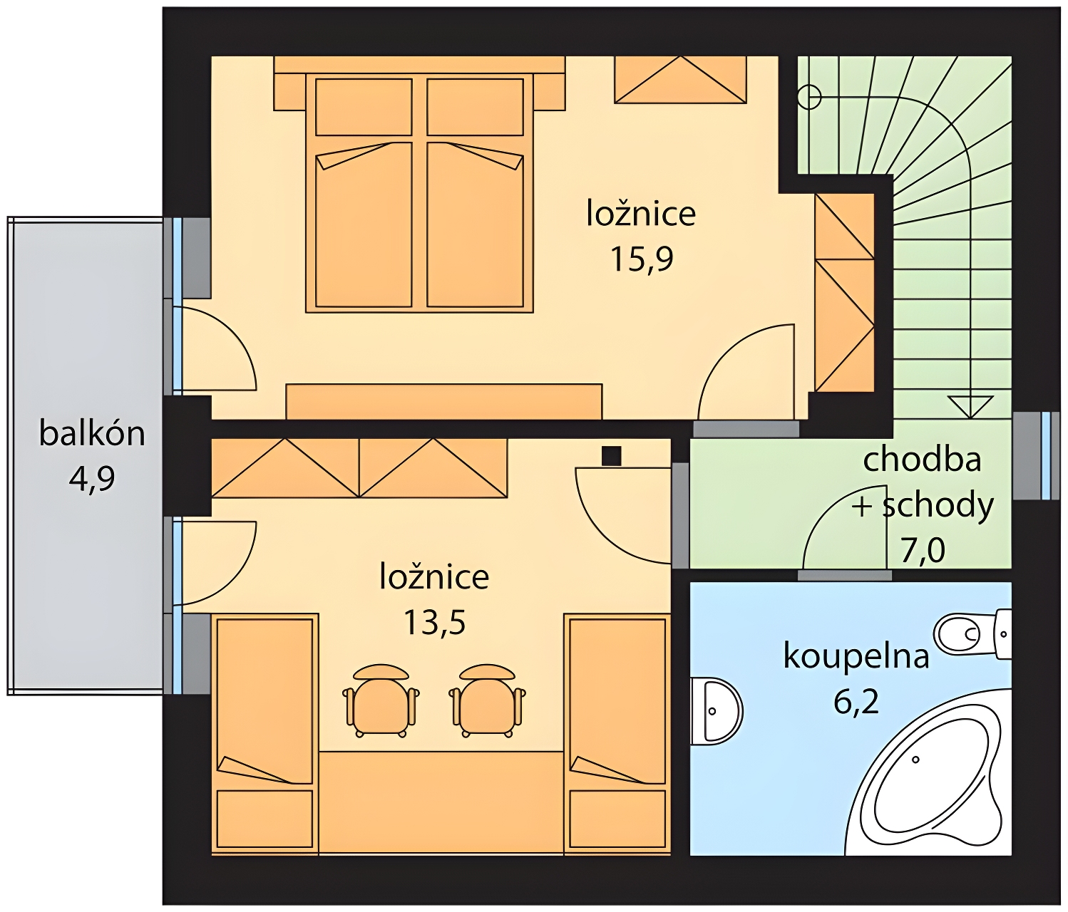 Rodinný dům RUMÍNA je malý přízemní dům s obytným podkrovím s obývacím pokojem a kuchyňským koutem v přízemí a 2 místnostmi v podkroví, určený pro bydlení jedné rodiny. Vstup do domu je zádveřím, ze kterého je přímo vstup do obývacího pokoje a vpravo na WC. Obývací pokoj je propojen s kuchyňským koutem. Z obývacího pokoje je přístup na terasu. Z chodby je přístupné WC a malá komora pod schodištěm. Schodištěm z obývacího pokoje se dostaneme do podkroví, kde se nachází dva pokoje se společným balkónem a koupelna.