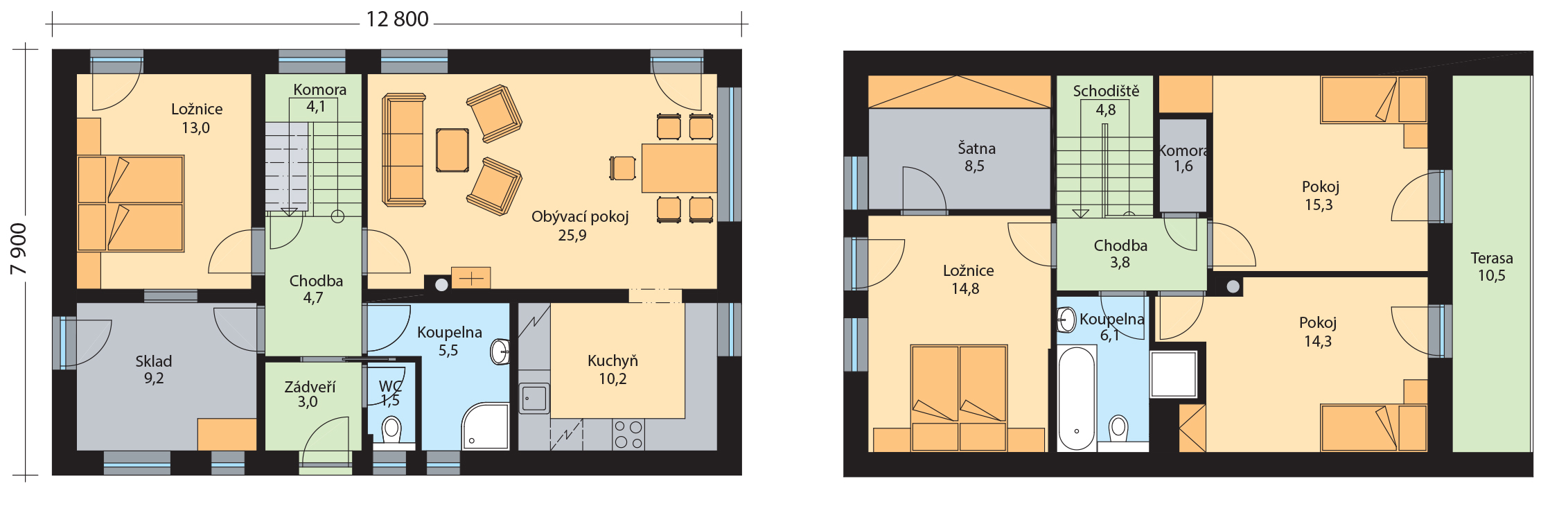 Rodinný dům SANDRA nabízí na obdélnikovém půdorysu dispozici, která umožní pohodlné bydlení i vícečlenné rodině. V přízemí se nachází kuchyně, obývací pokoj, ložnice, prostorný sklad se vstupem do zahrady, který může sloužit jako technická místnost a šatna, dále koupelna, WC a komora pod schory. V koupelně v přízemí je umyvadlo a sprchový kout. Balkonové dveře v obývacím pokoji umožňují přímé propojení interiéru s exteriérem, tedy obývacího pokoje se zahradou. Pokoj v přízemí lze díky samostatnému přístupu zvenčí využít i jako pohodlnou pracovnu, nebo pokoj pro hosty. V podkroví dispozice nabízí ložnici se šatnou, dva pokoje, koupelnu a malou komoru. V koupelně v podkroví je vana, sprchový kout, umyvadlo a wc. Obložení fasády cihličkami zajišťuje domu modernější vzhled, dle požadavku investora projekt můžeme dodat jen s fasádní omítkou bez obložení.
