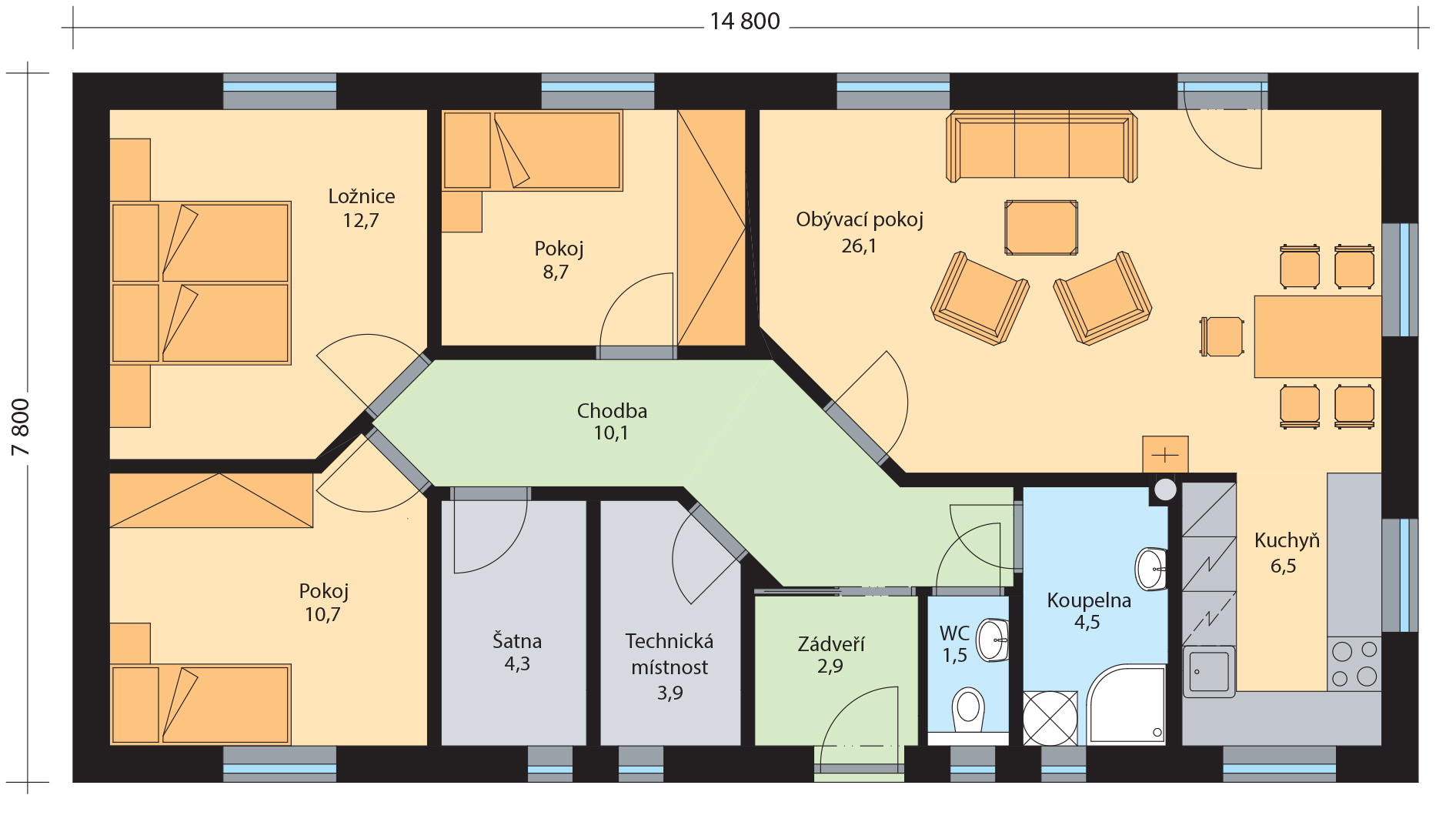Saša je přízemní rodinný dům, určený pro jednu rodinu. Do domu se vstupuje zádveřím do chodby, ze které se vstupuje do všech místností. V levé klidové části domu jsou dva pokoje a ložnice, přímo se vchází do obývacího pokoje s přilehlou samostatnou kuchyní. Tepelnou pohodu v obývacím pokoji může zajistit krb, nebo krbová kamna. Z obývacího pokoje se vstupuje na terasu. Dostatek úložného prostoru poskytuje šatna a technická místnost.
