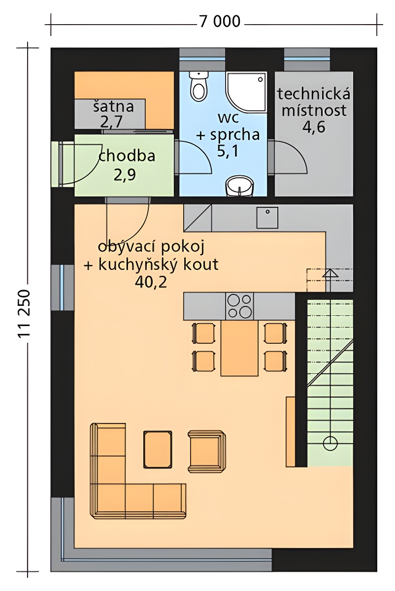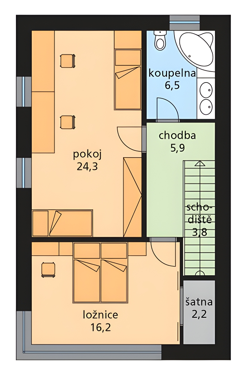 Rodinný dům Saskie je dvoupodlažní varianta domu Saskie s garáží. Dispozice je navržena pro bydlení jedné rodiny. Vstup do domu je přímo do chodby s oddělenou šatnou. Technická místnost umožní dovybavit technologiemi pro nízkoenergetický nebo pasivní standard. Prostorný obývací pokoj tvoří centrální obytný prostor v 1.NP s kuchyňským koutem a schodištěm vedoucím do patra. Francouzská okna v obývacím pokoji umožňují nejen propojení interiéru s exteriérem, ale hlavně dostatečné osvětlení. V 2.NP je ložnice s vlastní šatnou, koupelna, pokoj dětí, který lze rozdělit na dva menší pokoje. Dům je vhodný i na užší pozemek, lze jej zrealizovat i jako dvojdomek.