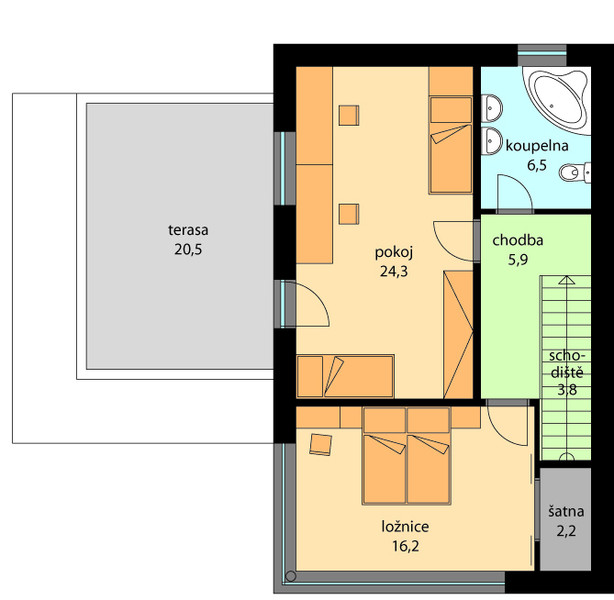 Rodinný dům Saskie je dvoupodlažní dům s garáží, určený především do městské zástavby, který lze zrealizovat i jako dvojdomek, nebo řadový dům. Jednoduchá dispozice umožní pohodlné bydlení jedné rodině, kde v 1.NP se nachází prostorný obývací pokoj s kuchyňským koutem a schodištěm vedoucím do patra. Francouzská okna v obývacím pokoji umožňují nejen propojení interiéru s exteriérem, ale hlavně dostatečné osvětlení. V 2.NP je ložnice, pokoj dětí, který lze rozdělit na dva menší pokoje. Z pokoje dětí se vstupuje na prostornou terasu situovanou nad garáží domu. Projekt nabízíme i ve variantě bez garáže - SASKIE.