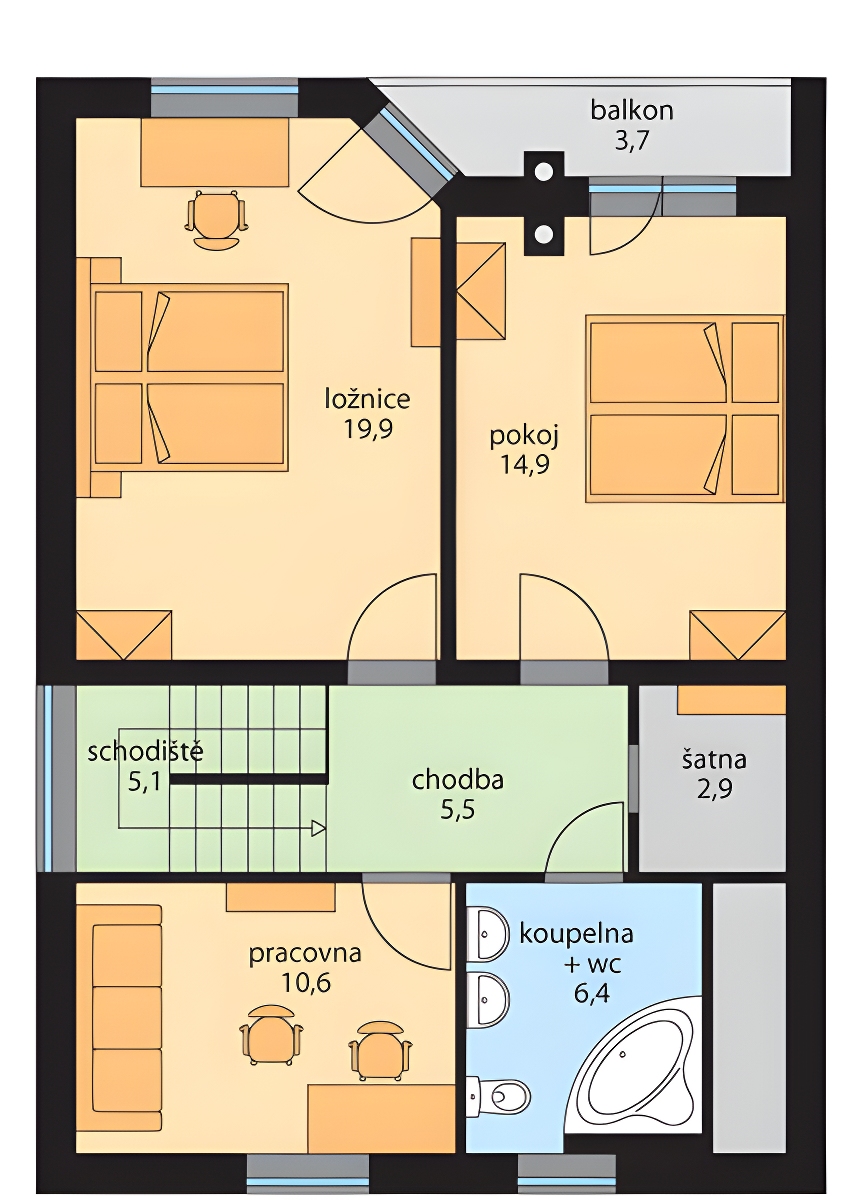 Rodinný dům Sibyla je klasický přízemní dům s plně využitým podkrovím, se sedlovou střechou. Rozměrově sice patří mezi domy menší velikostní kategorie, ale dispozičně umožní bydlení jedné i více členné rodině-v přízemí v obývacím pokoji s kuchyňským koutem, v pokoji, který lze využít jako ložnici, pracovnu nebo pokoj pro hosta. Z obývacího pokoje je vstup na terasu, která je částečně zastřešena. Krbová kamna v obývacím pokoji jsou situována tak, že na komín lze napojit i krb na terase. Schodiště v hale umožňuje přístup do podkroví, kde se nachází dvě ložnice, šatna a pracovna. Z ložnic je vstup na balkon. Dům lze stavět etapově. Fasáda je řešena kombinaci omítky a obkladových cihliček. Lze ji řešit pouze štukovou omítkou, odstín dle výběru investota.