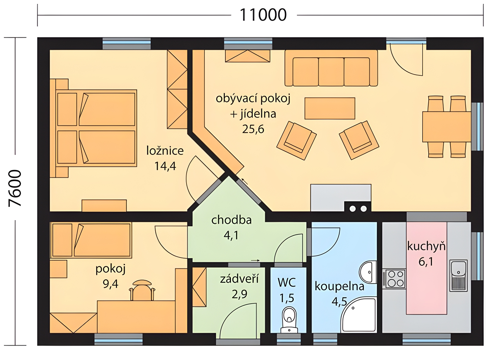 Samostatně stojící přízemní rodinný dům, určený pro jednu rodinu. Do domu se vstupuje zádveřím do chodby, ze které se vstupuje do všech místností. V levé části domu je pokoj a ložnice, přímo se vchází do obývacího pokoje s přilehlou samostatnou kuchyní. Tepelnou pohodu v obývacím pokoji může zajistit krb, nebo krbová kamna. Z obývacího pokoje se vstupuje na terasu. Dům je vhodný do rovinného terénu i svažitého terénu a možnou variantou je rozšíření o obytné podkroví (viz. dům ŠIMON 2).