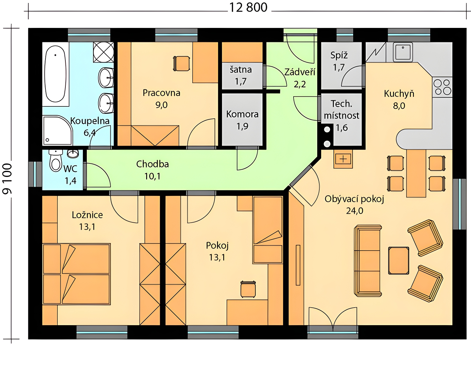 Rodinný dům Tomáš je moderní menší bungalov, který poskytne pohodlné bydlení jedné rodině. Ze zádveří se vstoupí do chodby, která propojuje všechny místnosti- obývací pokoj je propojený s kuchyní, ložnici, pokoj dětí, pracovnu, koupelnu, WC. Řešení dispozice nabízí i dostatečné množství úložných prostor-šatnu, komoru, spíž i technickou místnost. Z obývacího pokoje je vstup na terasu. Dům má komín- v obývacím pokoji lze vybudovat krb, nebo instalovat krbová kamna