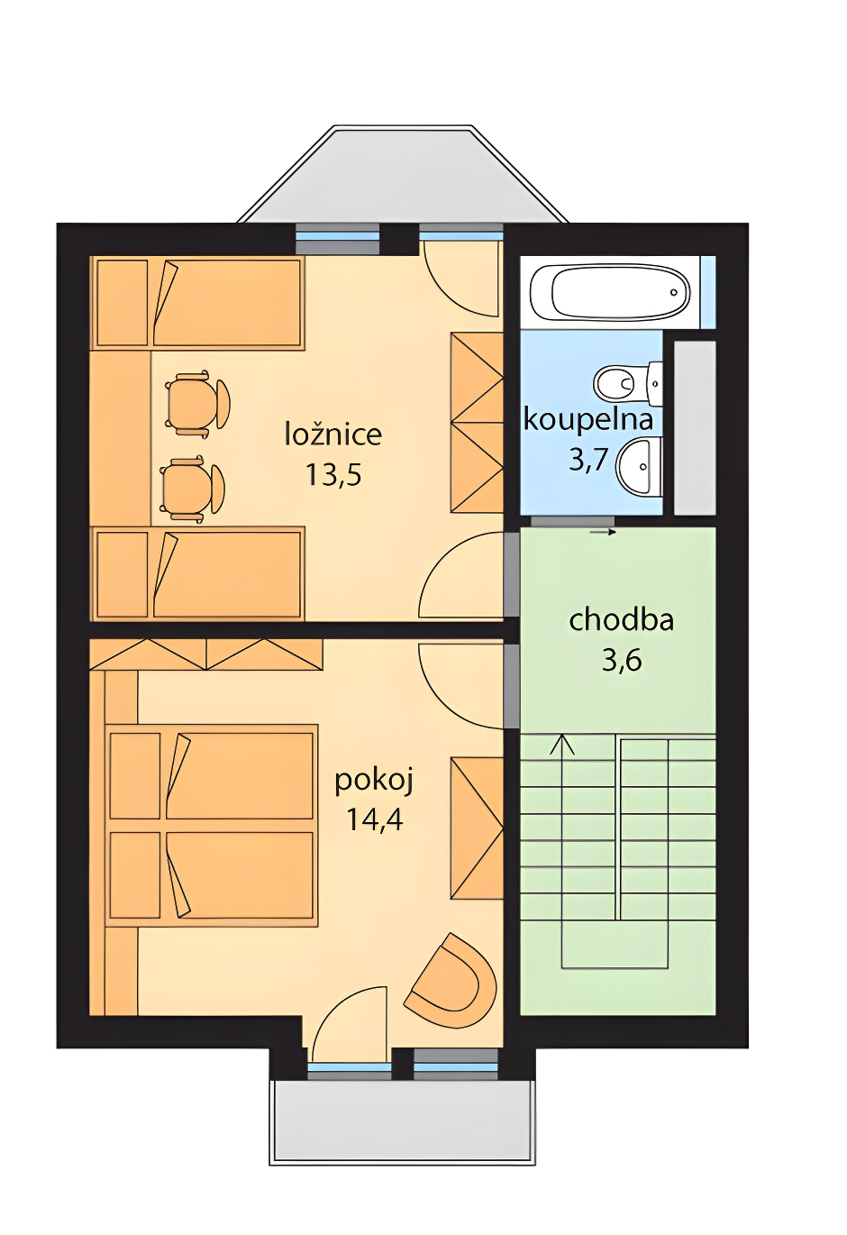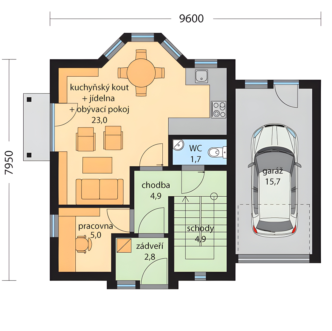 Rodinný dům ZORA je menší dům s plně využitým podkrovím, balkónem a přistavěnou garáží. V přízemí se nachází obývací pokoj s jídelnou a kuchyňský kout, pracovna, která může být využita jako pokoj pro hosta, nebo jako šatna, komora. V podkroví je ložnice, dětský pokoj, koupelna s vanou, toaletou a umyvadlem. Z obývacího pokoje je umožněn přístup na venkovní terasu. Dům je vhodný do rovinného i mírně svažitého terénu.