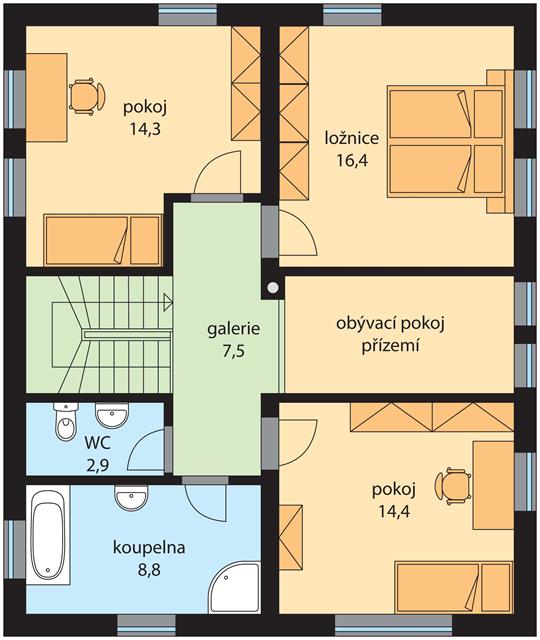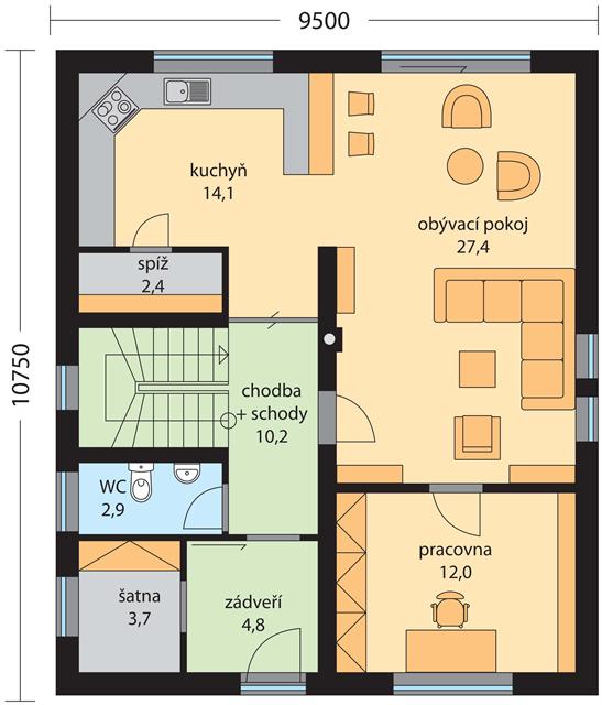 Moderní dvoupodlažní rodinný dům Zuzanka je vhodný pro pohodlné bydlení jedné rodiny. Ze zádveří je vstup do šatny a chodby, ze které vedou samostatné vstupy na WC a do obývacího pokoje s kuchyňským koutem. Součástí kuchyňského koutu je i spíž. V obývacím pokoji je možno postavit krb, nebo instalovat krbová kamna. V druhém nadzemním podlaží jsou dva pokoje a ložnice. Hygienické a sociální zázemí zajišťuje samostatná místnost wc, kde je umístěn kotel a také koupelna.